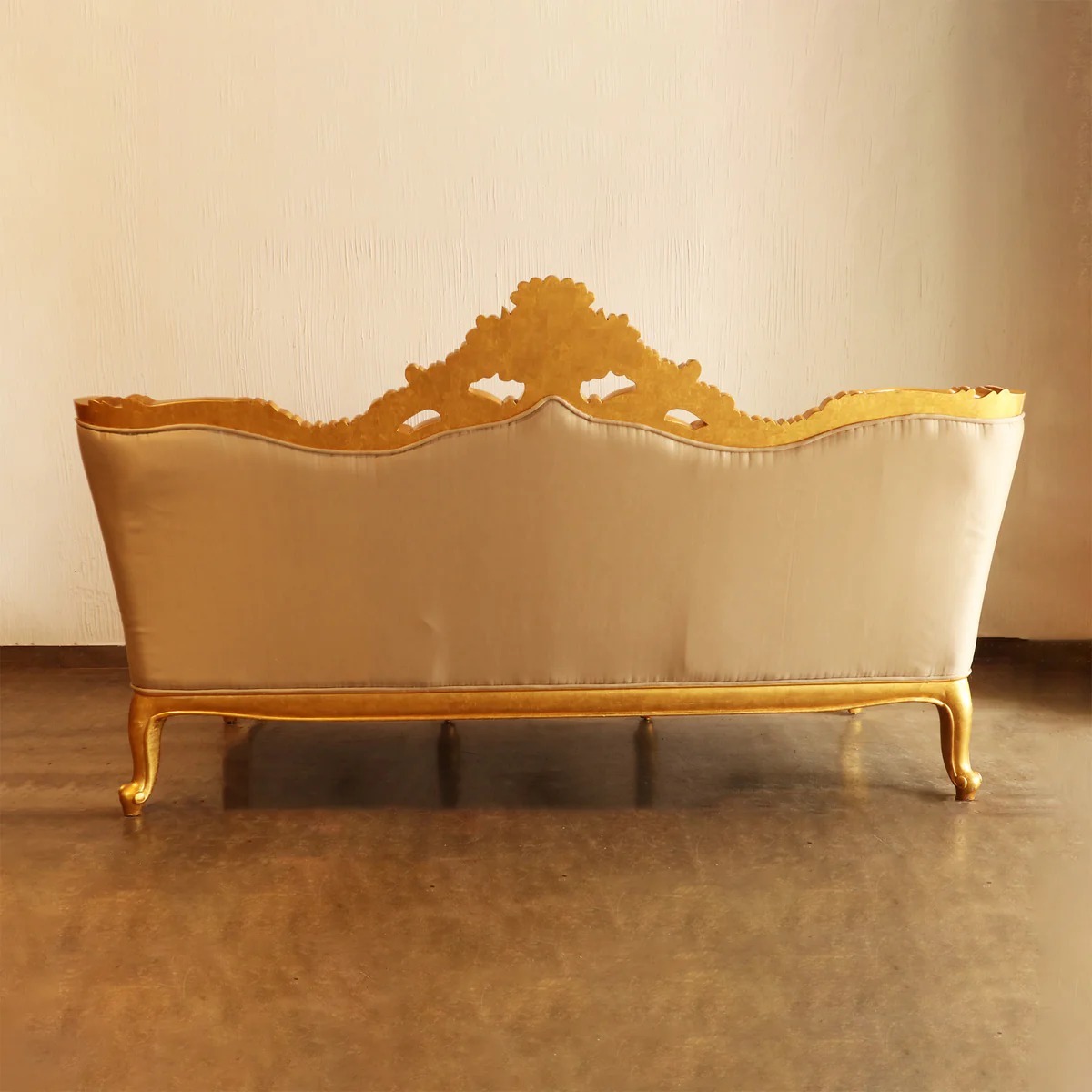The sofa is finished in rich antique gold paint, which beautifully enhances the deep hand-carved details and gives it a classic royal appearance. The double-side carving makes this sofa visually appealing from every angle, allowing it to be placed in open or center seating layouts. Each carving is carefully done by skilled artisans, reflecting timeless artistry and attention to detail.