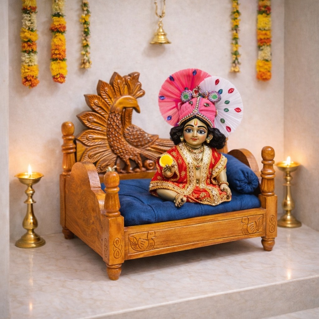 Give your Laddu Gopal Ji a peaceful and beautiful resting space with this handcrafted traditional bed for Laddu Gopal by Shalvika Living. Made from premium teak wood, this bed reflects true devotion and fine craftsmanship. The elegant peacock carving design adds a divine and royal touch to your mandir. Each piece is carefully made by skilled artisans without using machines, ensuring a unique and soulful finish. Perfect for daily seva and festive decoration, this bed enhances the spiritual feel of your home.