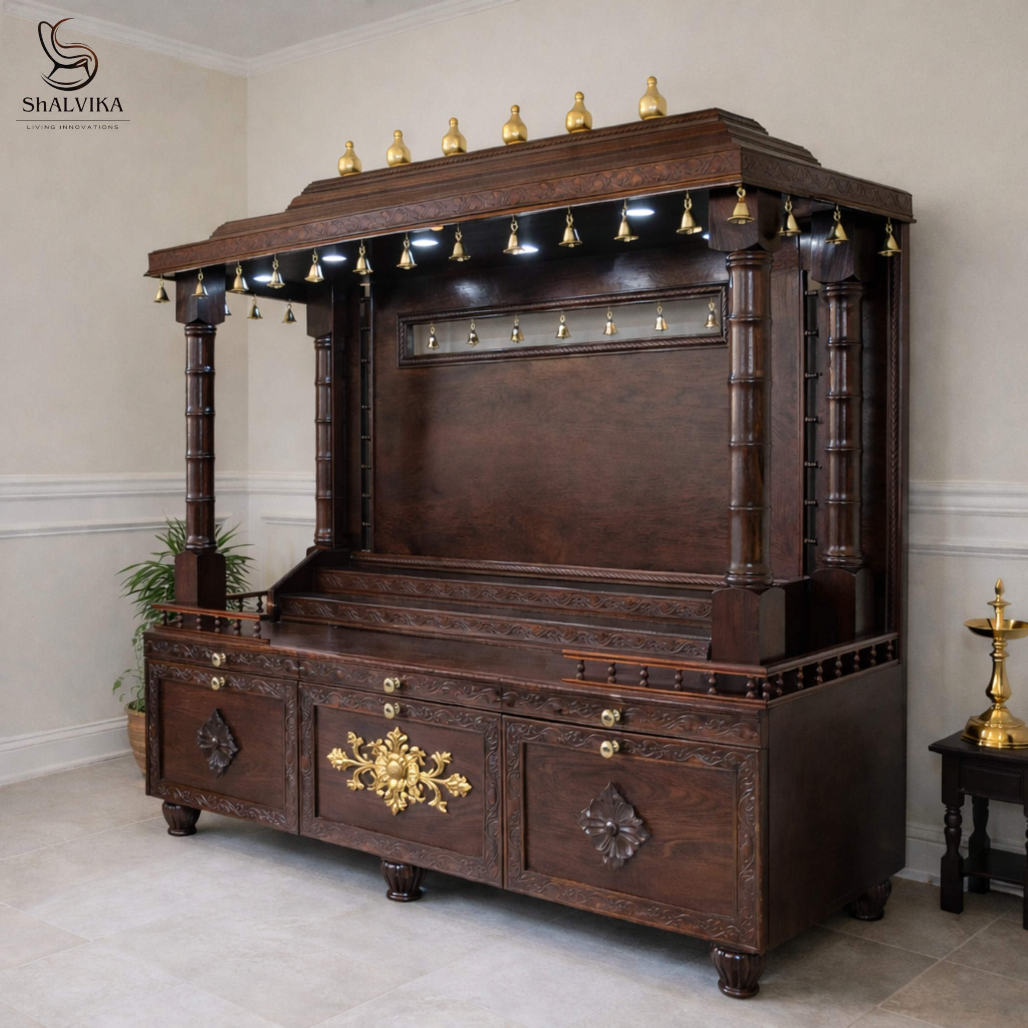 The bottom section features two large cabinets, a central storage area, and a diya tray, providing ample space for pooja essentials. Despite its grand design, the temple comes in a DIY knock-down format, making it easy to assemble and transport worldwide.