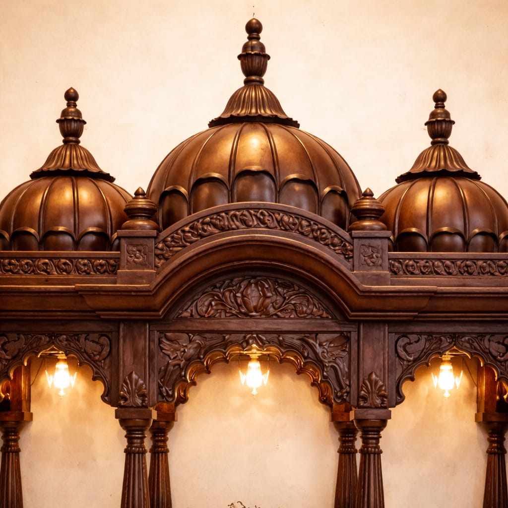 The highlight of this mandir is its elegant lotus dome design, symbolizing purity, peace, and devotion. Intricately hand-carved arches, pillars, and decorative details reflect traditional Indian temple architecture and showcase the skill of experienced artisans. The fine craftsmanship adds depth and character, making this wooden temple both visually striking and spiritually uplifting.