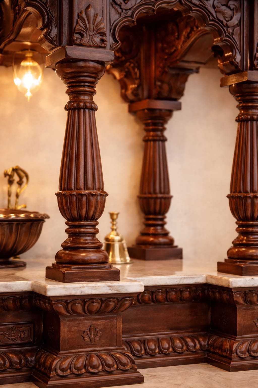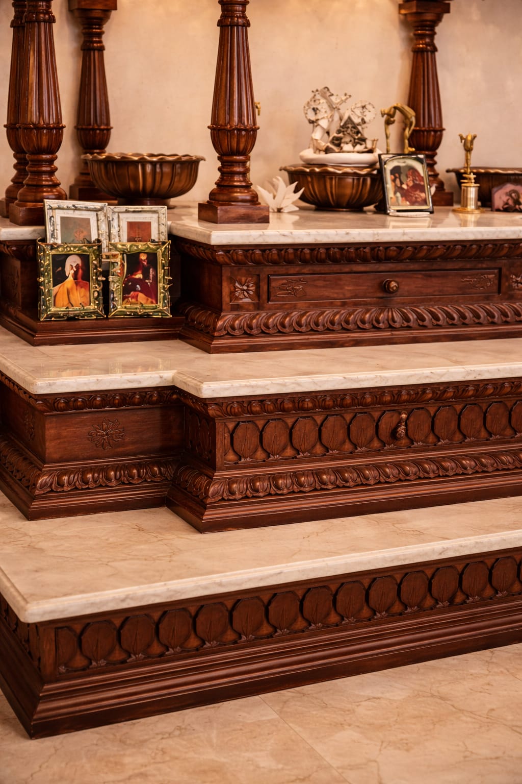 At Shalvika Living Innovations, we offer complete customization for this home wood temple. From size and finish to carving details and layout, every element can be tailored to suit your space and personal preferences.