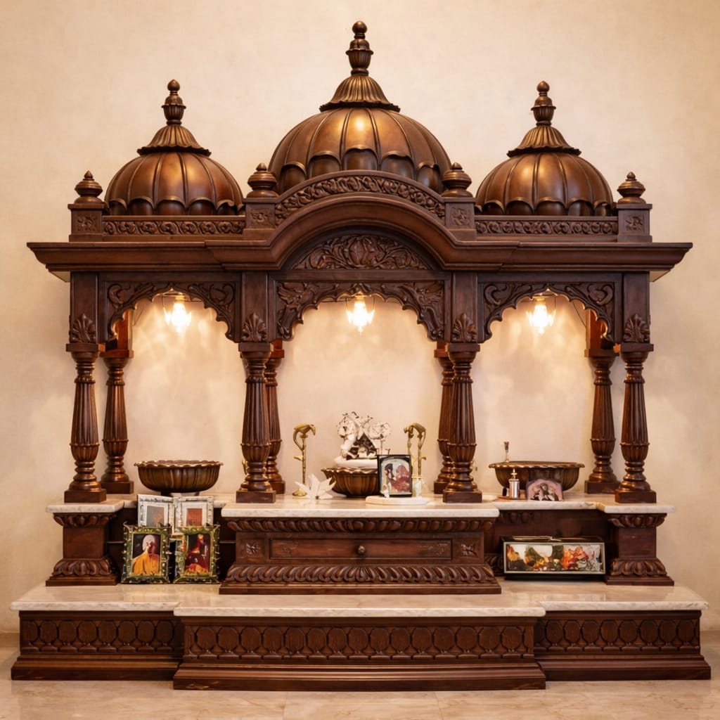 The Big Home Wood Temple with Lotus Domes is a perfect blend of spirituality, craftsmanship, and luxury. Designed to elevate your sacred space, this temple is crafted from premium-quality solid teak wood, known for its strength, durability, and timeless appeal. The natural richness of teak wood ensures long-lasting beauty and makes this temple a valuable addition to your home.
