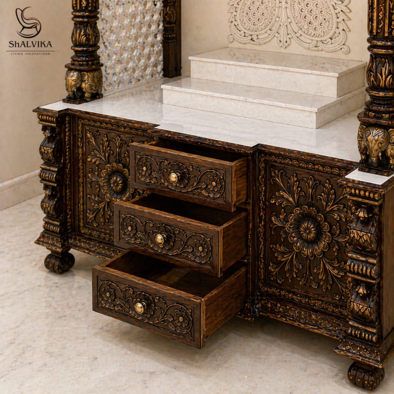 Handcrafted Traditional Teak Wood Home Temple with Storage