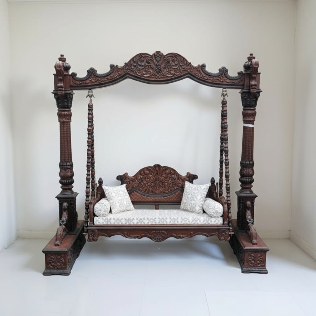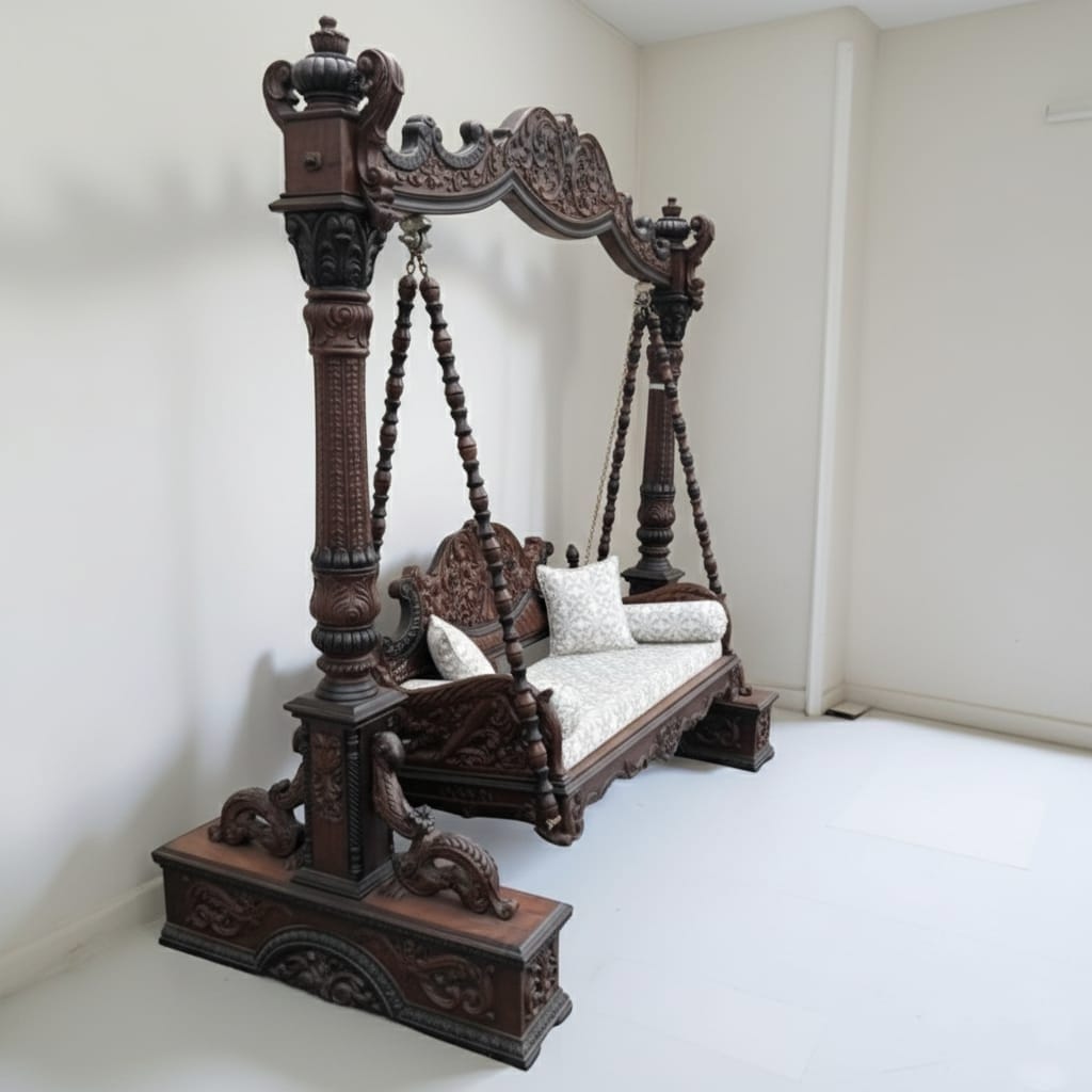 The swing seat features an exquisitely carved jaali pattern on the backrest, adding both beauty and ventilation. Every curve, line, and motif tells a story of patience and precision — the kind only skilled artisans can create. Hanging gracefully from strong brass chains, the swing moves smoothly while exuding royal charm with its antique finish.