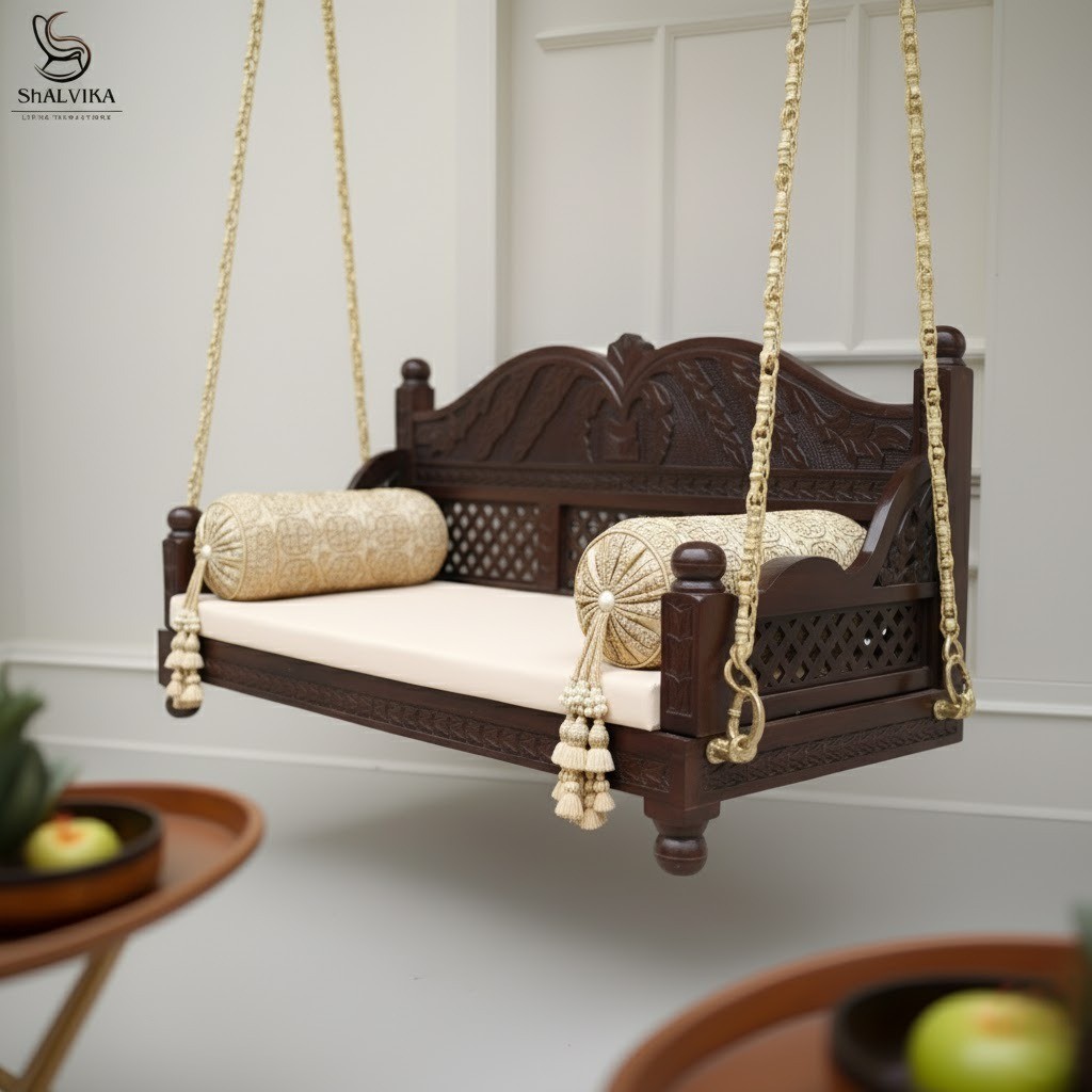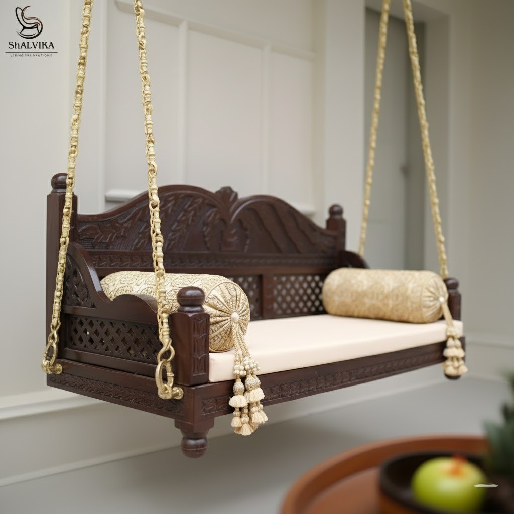 The Hanging Jhula with Brass Chain by Shalvika Living is a beautifully handcrafted wooden swing made from premium quality Teak Wood. Designed to bring comfort and an elegant traditional touch to your interiors, this swing fits perfectly in living rooms, lounge spaces, balconies, and indoor verandas. The backrest features hand-carved detailing combined with a classic jaali-style pattern, giving the swing a rich and artistic appearance.