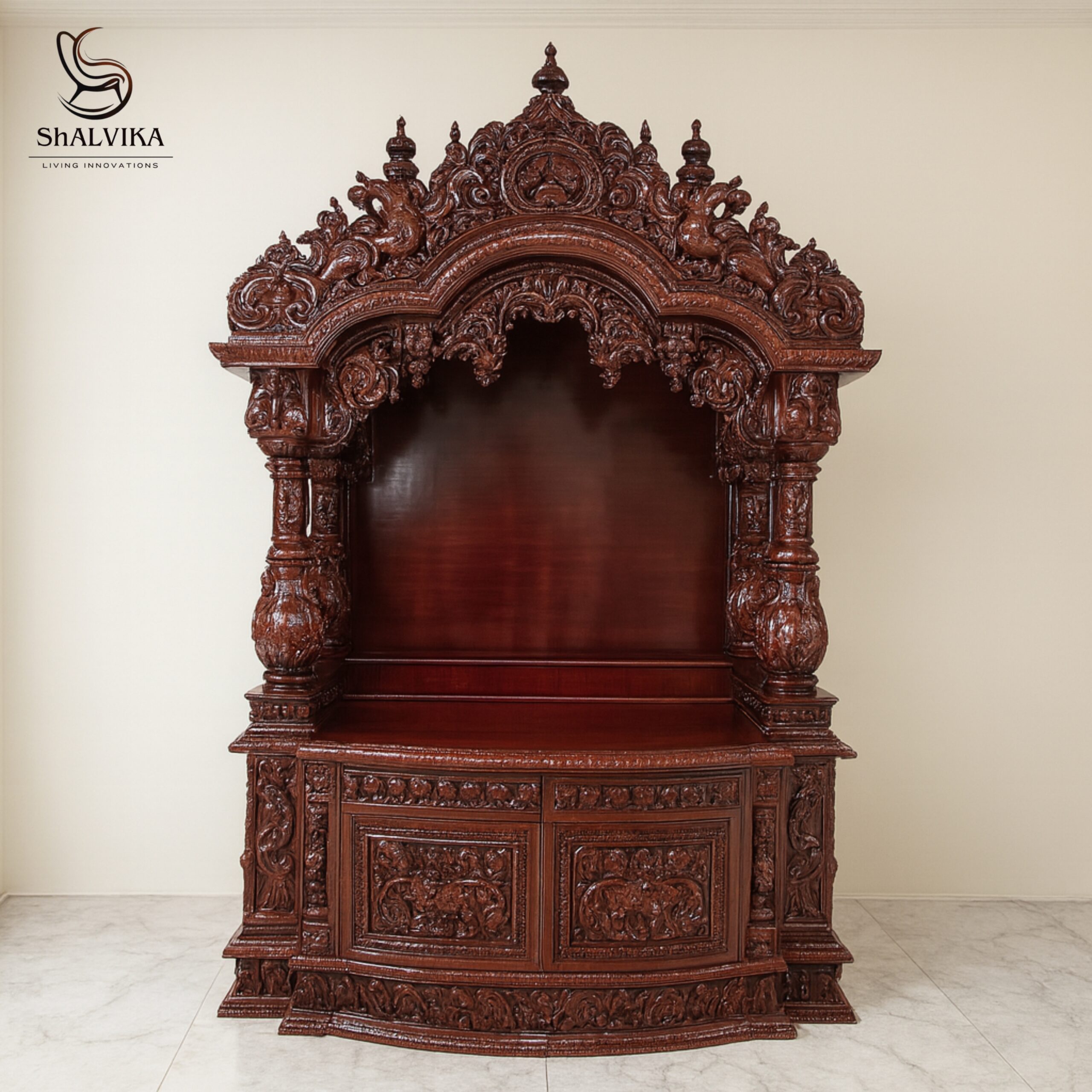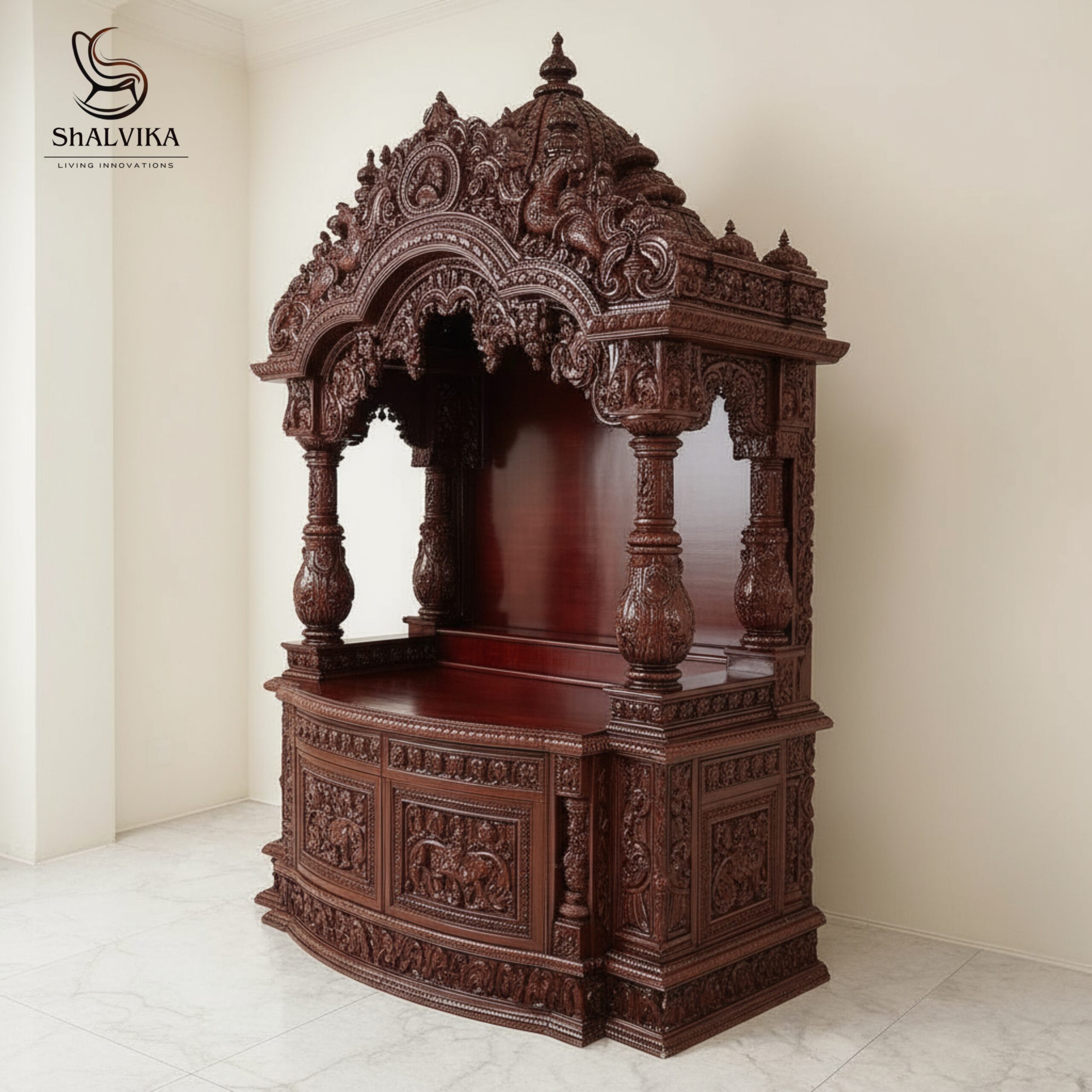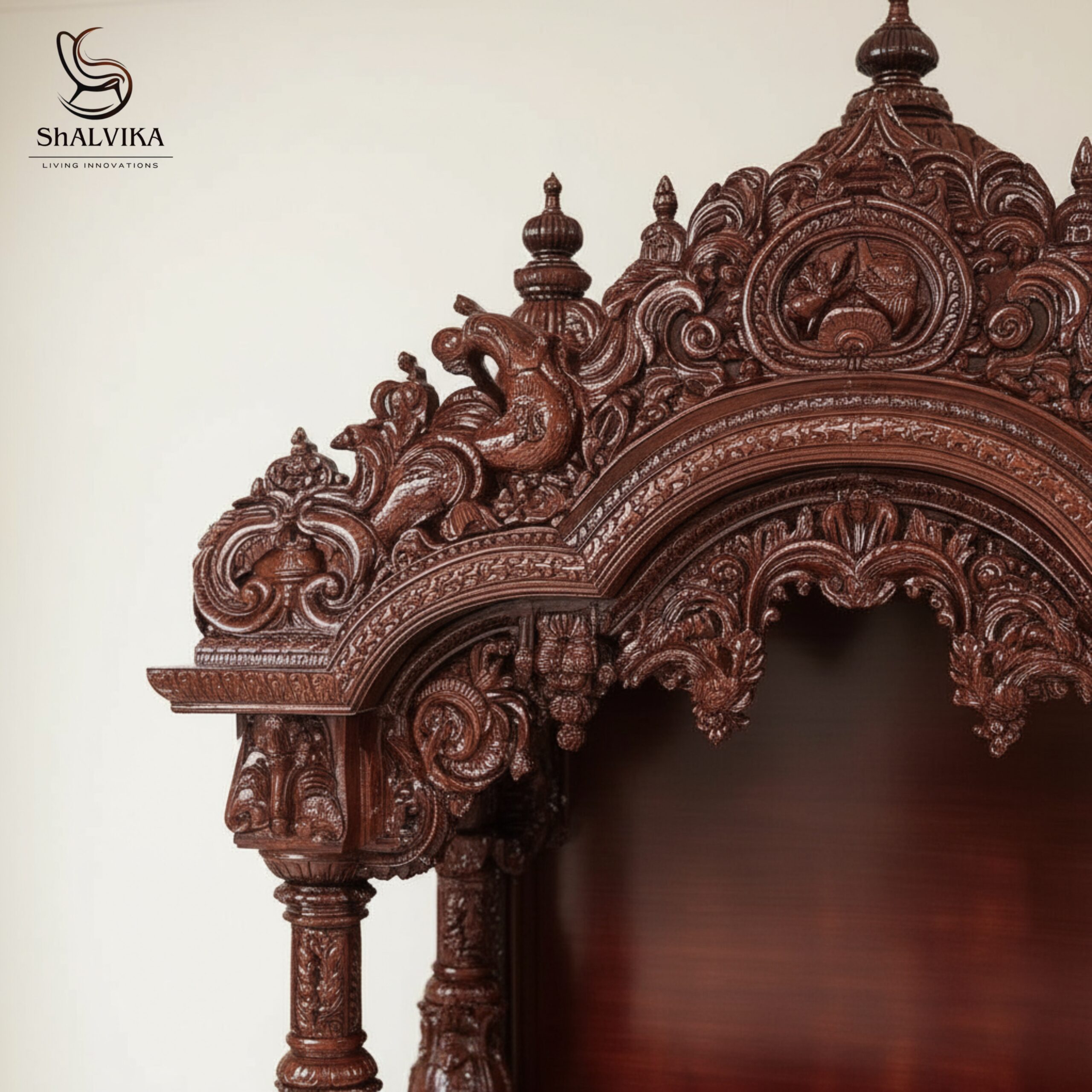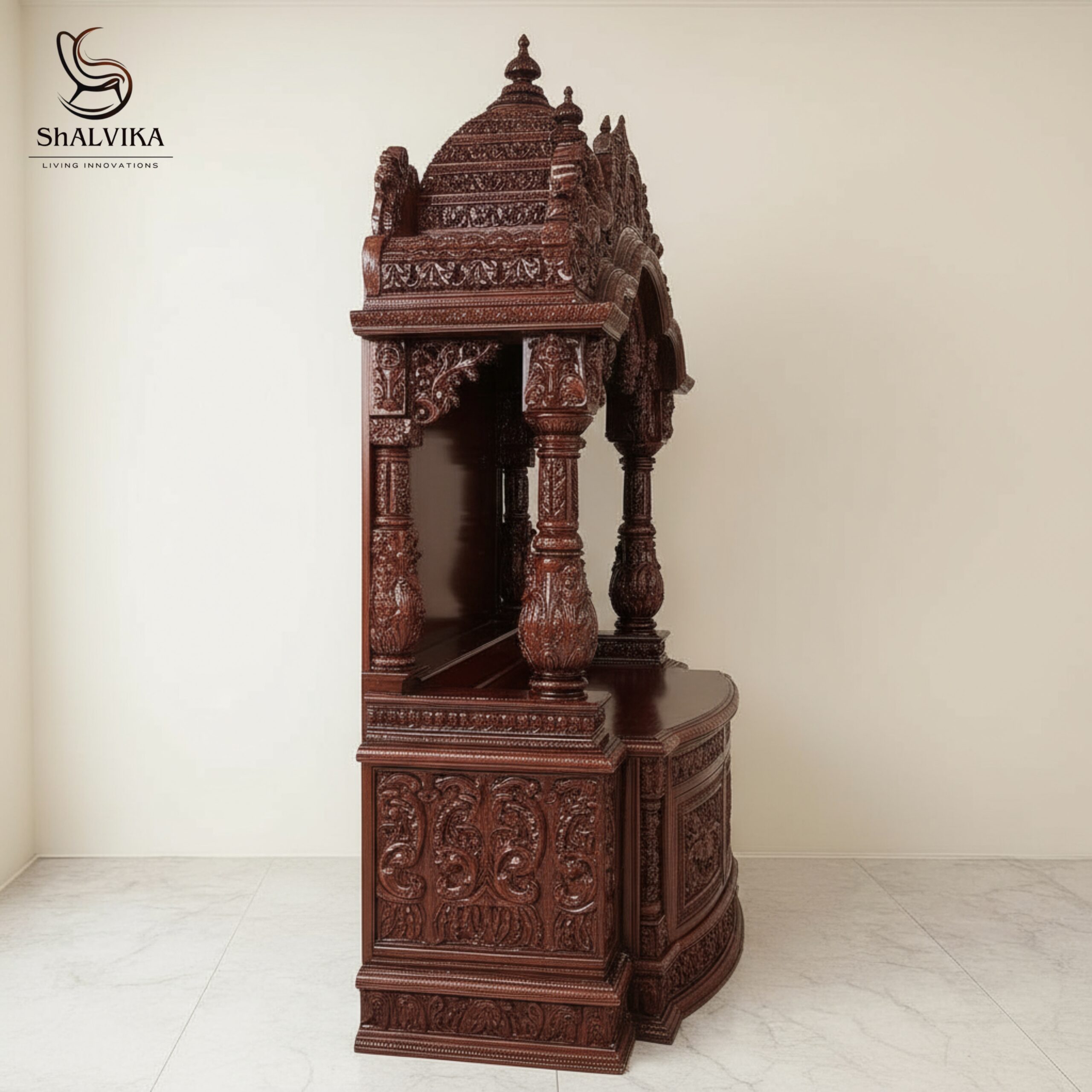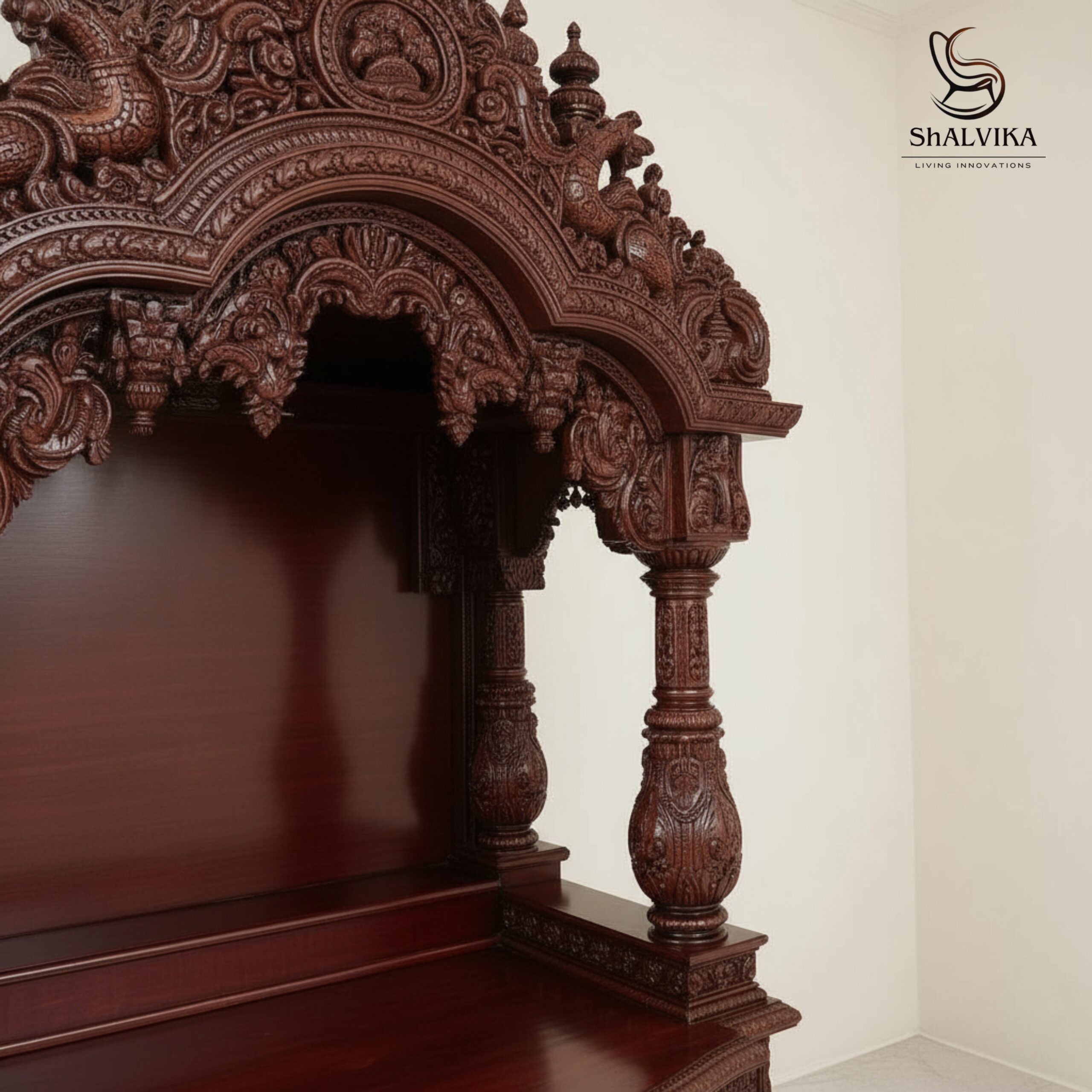 Wooden Pooja Room Design – Heavy Carved Teak Wood Temple by Shalvika Living