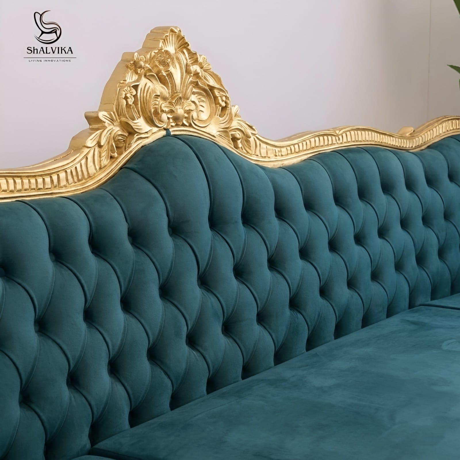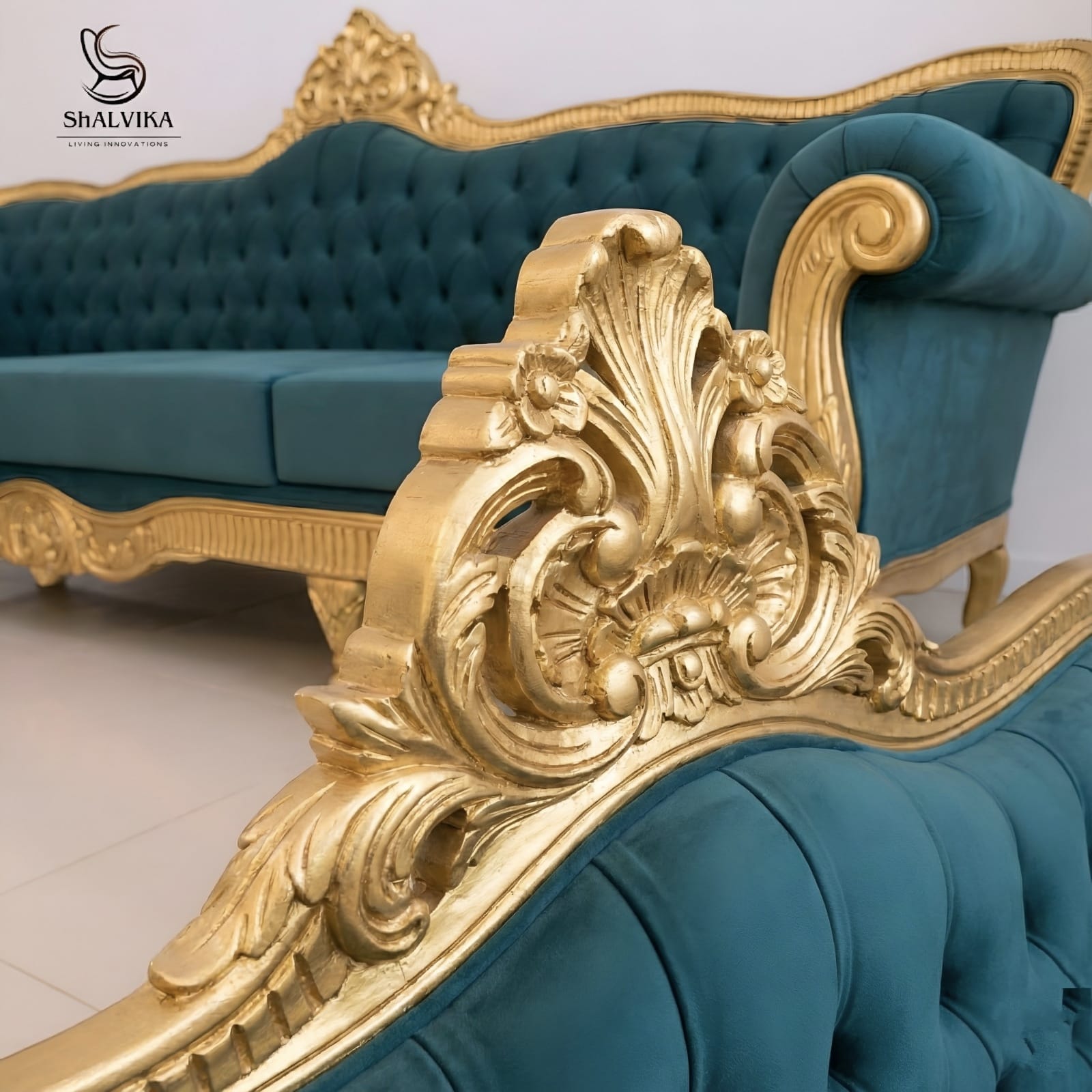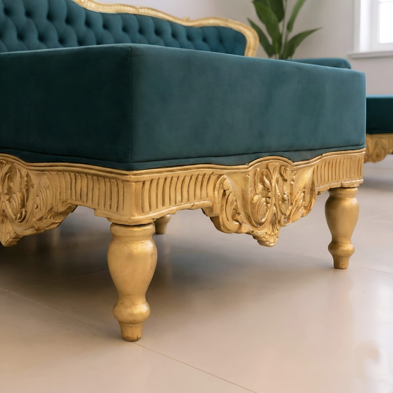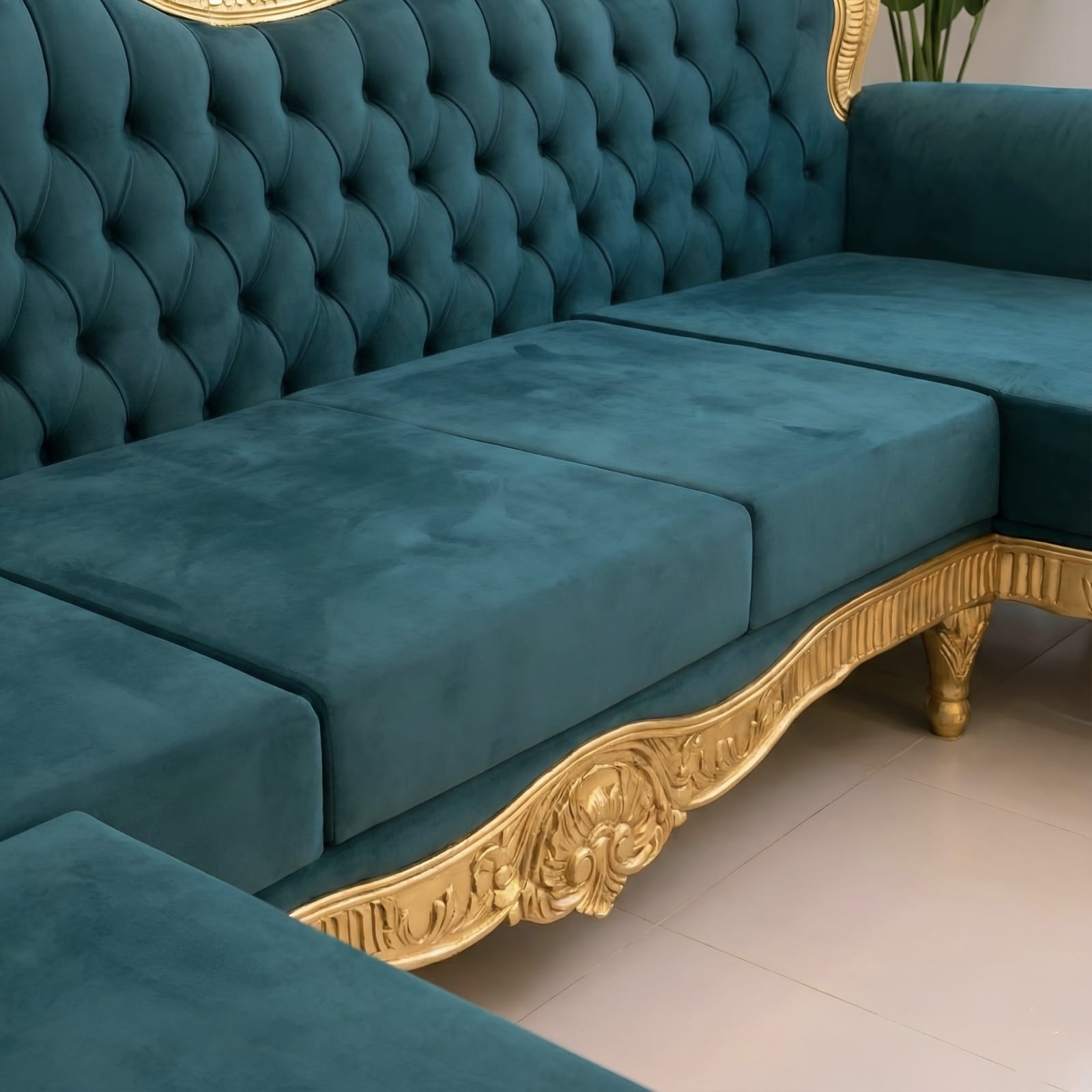 Finished in a rich Gold Deco Paint, the carved details stand out beautifully, offering a sophisticated contrast to the plush velvet upholstery. The deep-button tufting and high-density cushioning provide superior comfort for everyday lounging and family gatherings.