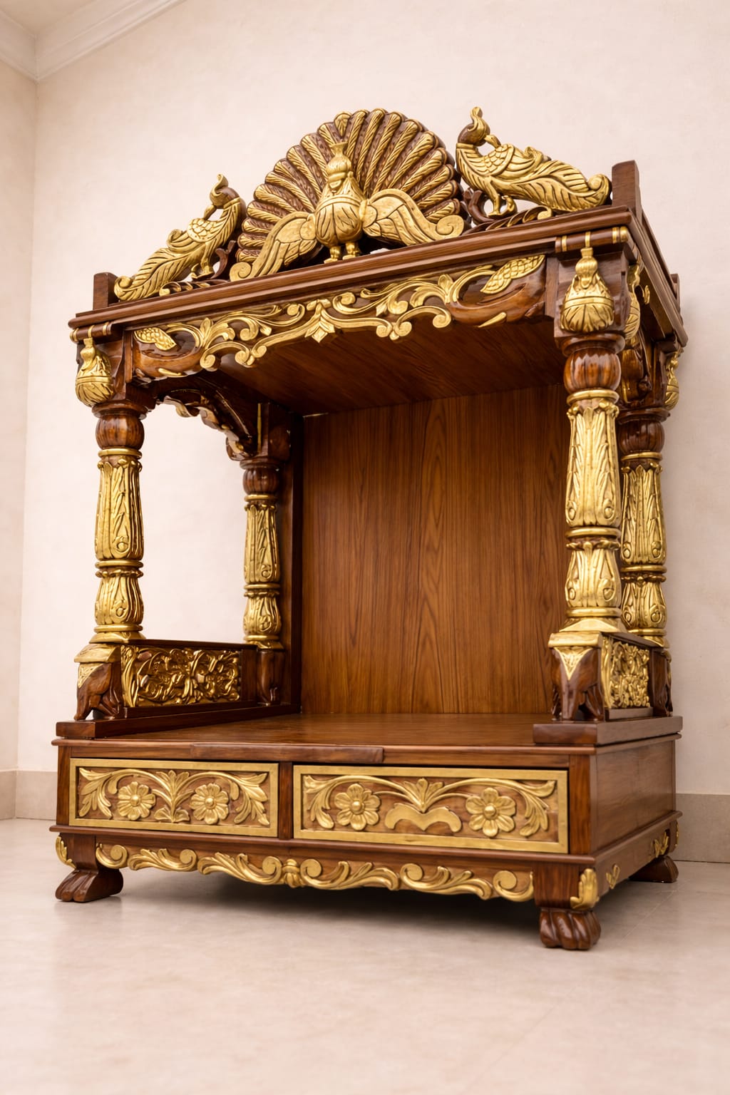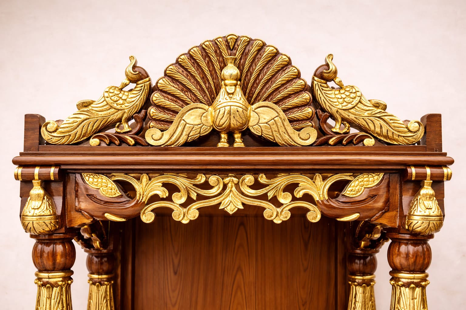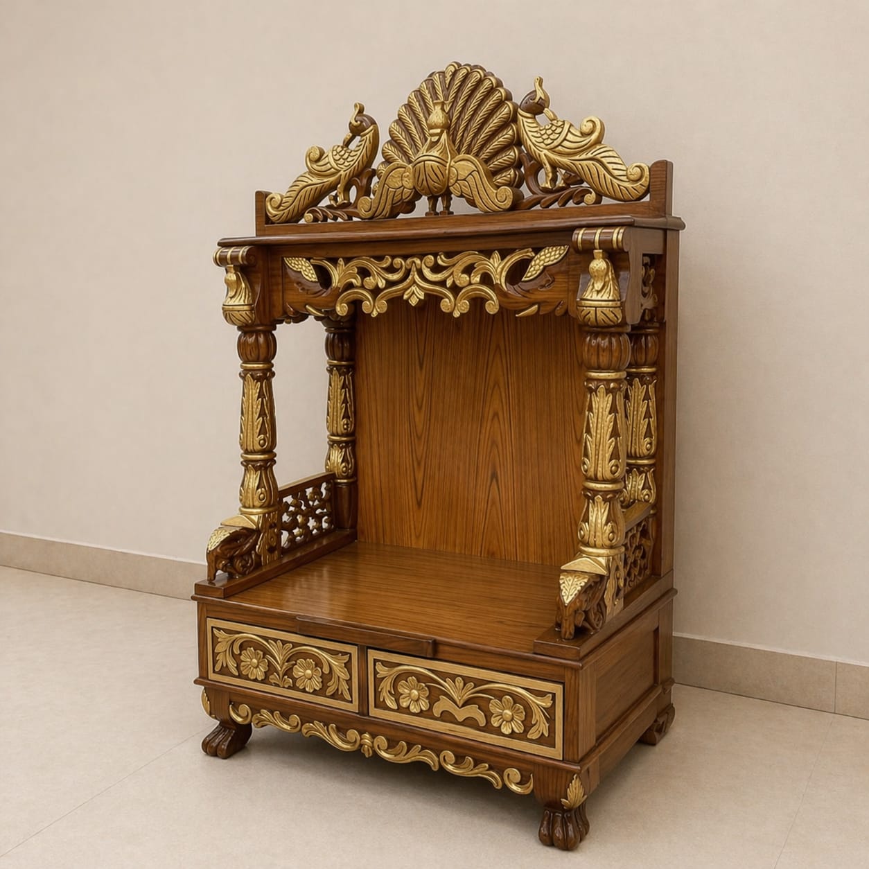Elegant Peacock Design Mandir in Teak Wood