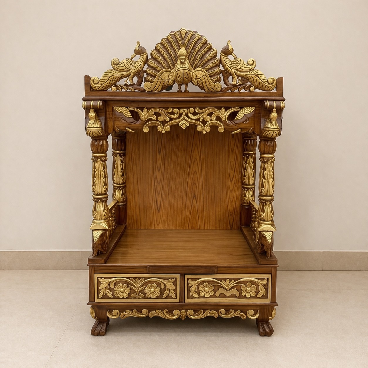 Teak Wood Pooja Mandir in Peacock Design