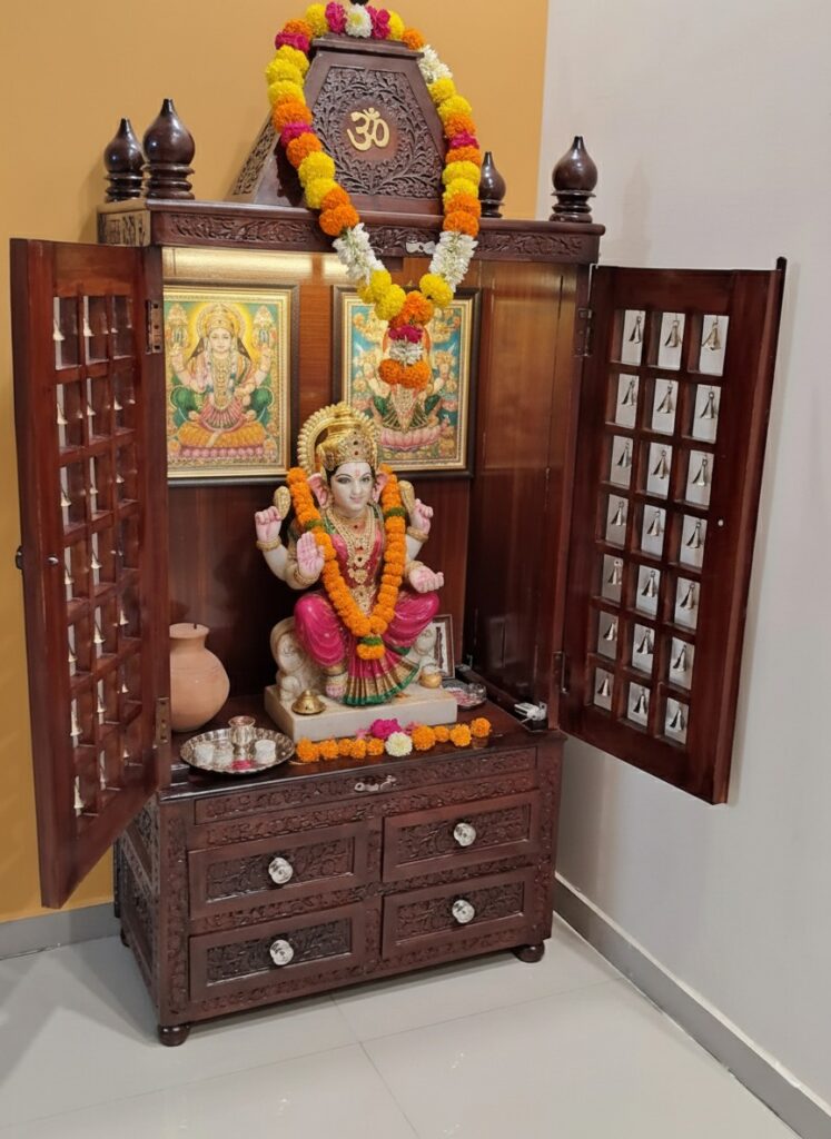 Each piece is made from high-quality Sheesham wood with teak plywood used for the back and inner sections, ensuring strength and long life. The multiple brass bells on the doors add a peaceful, devotional sound to your pooja rituals.