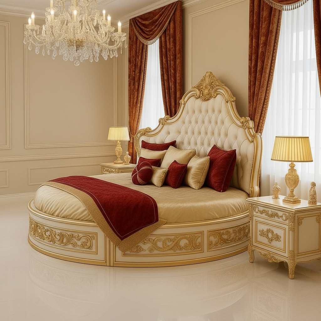 Each part of this round bed is hand-carved and hand-polished by skilled artisans. The high curved headboard, with 3 to 8-inch thick carvings, features floral detailing and a comfortable cushioned backrest for ultimate relaxation. The subtle antique gold finish enhances the rich design, creating a perfect balance between sophistication and luxury.
