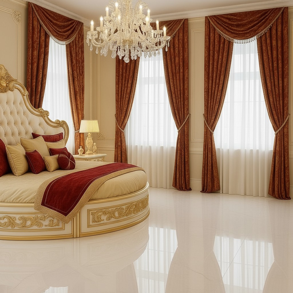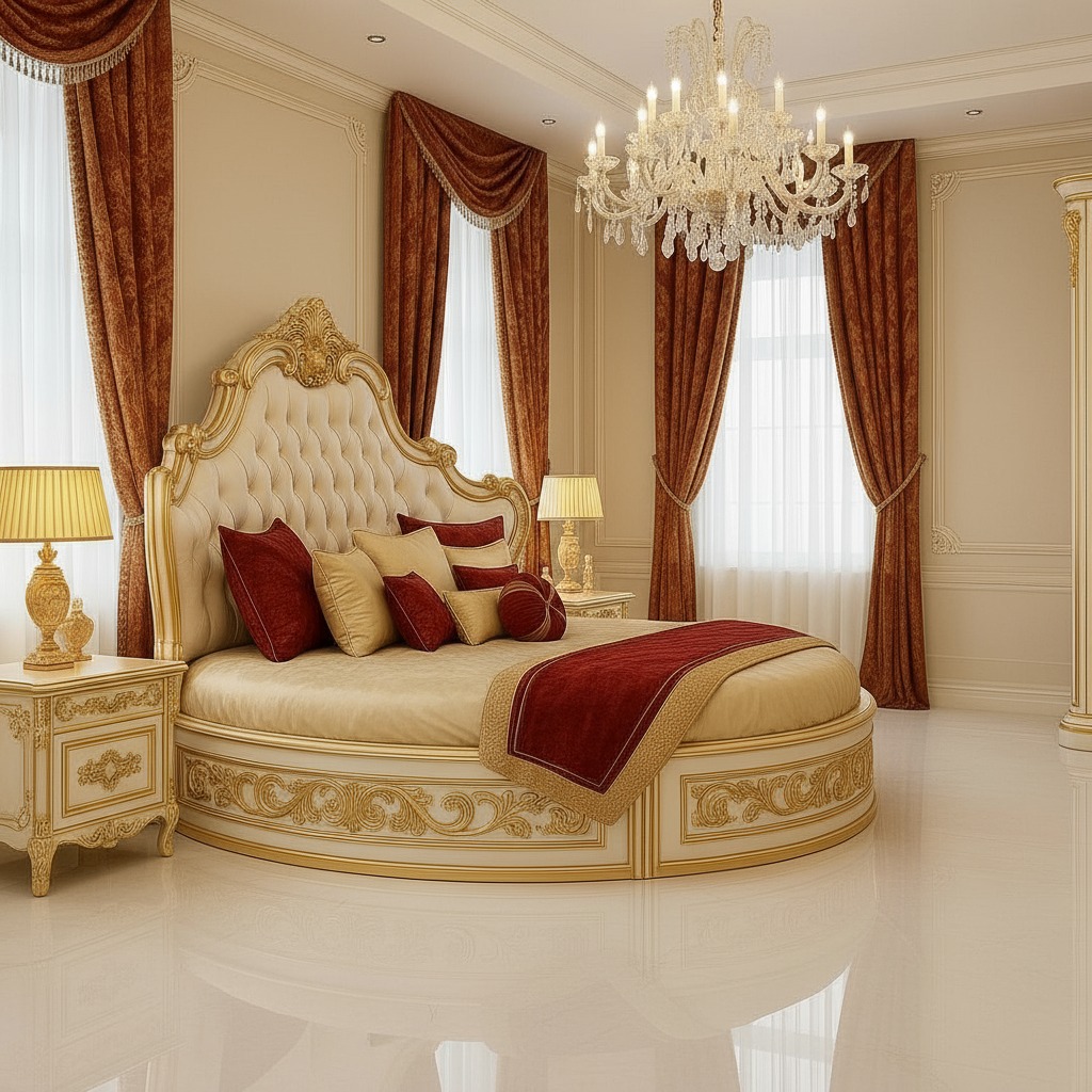 The Round Bed Design for Royal Home by Shalvika Living is a symbol of luxury, artistry, and timeless elegance. Crafted from premium-quality teak wood and finished in white deco paint with gold highlighting, this handcrafted masterpiece adds royal grandeur to any bedroom. The circular design, combined with intricate carvings and a plush upholstered headboard, gives your space a majestic and elegant look.