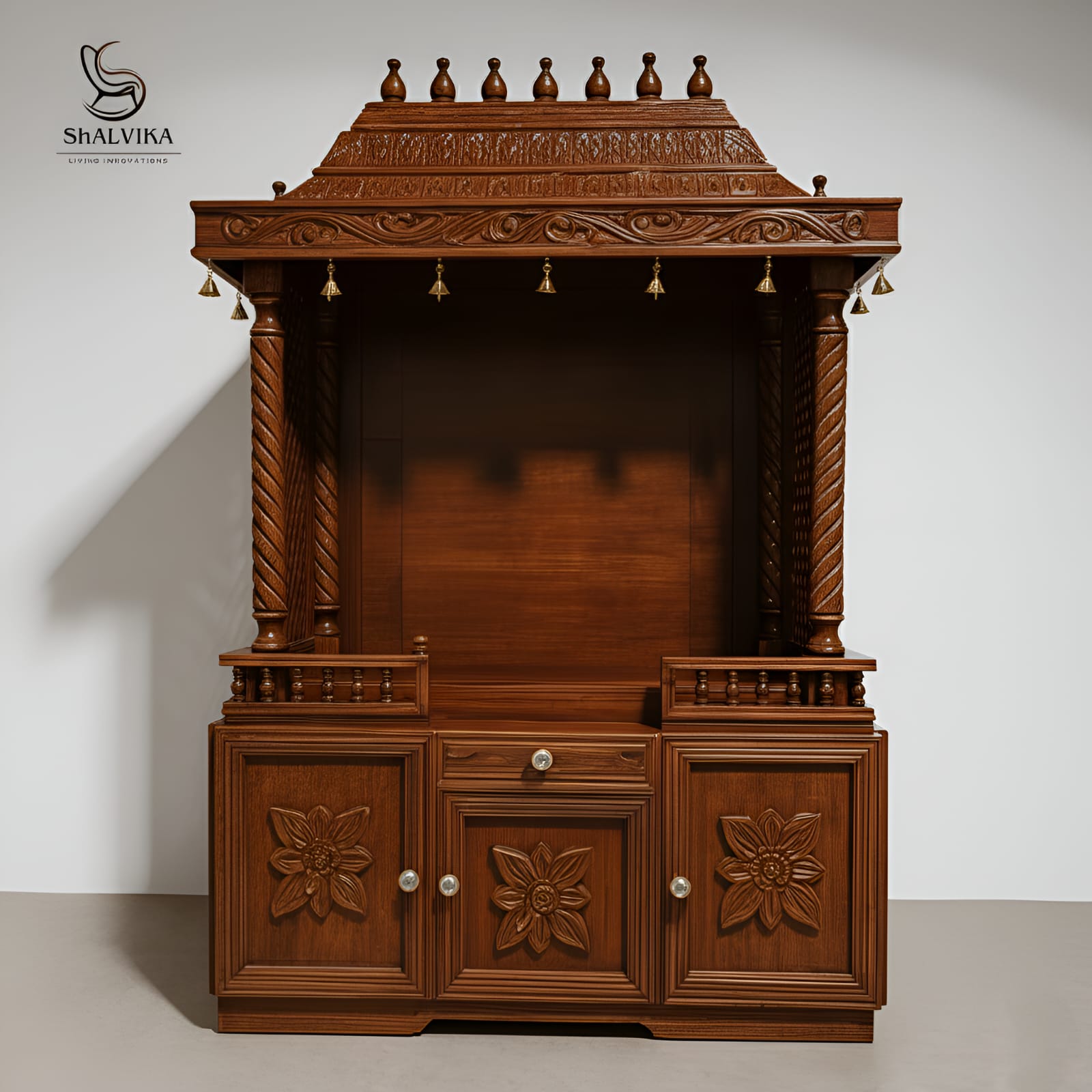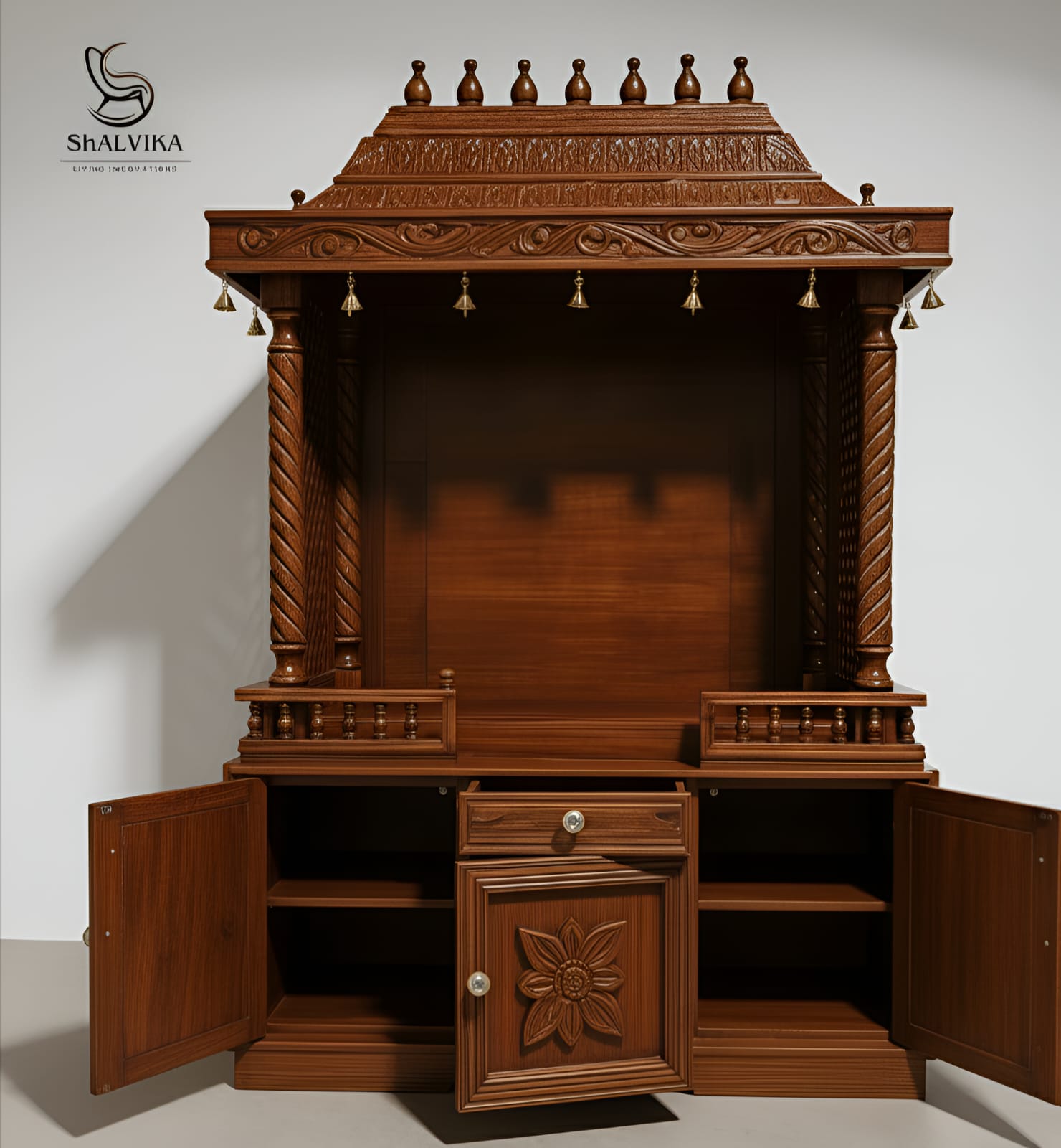 Bring divine presence, heritage, and elegance into your home with this South Indian Temple Design handcrafted by Shalvika Living. Made from premium-grade Teak Wood, this pooja mandir beautifully combines traditional Dravidian architecture with modern functionality, making it perfect for apartments, villas, and dedicated pooja rooms.