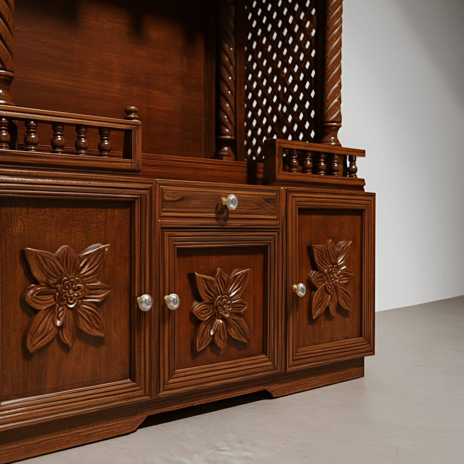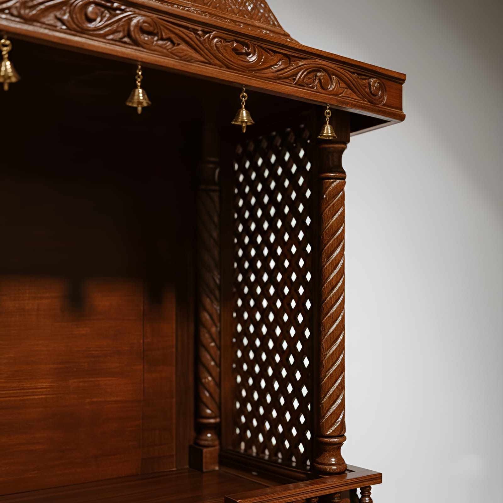 Crafted by skilled Saharanpur artisans, this wooden temple is strong, termite-resistant, and fully customizable in size, polish, and color.
