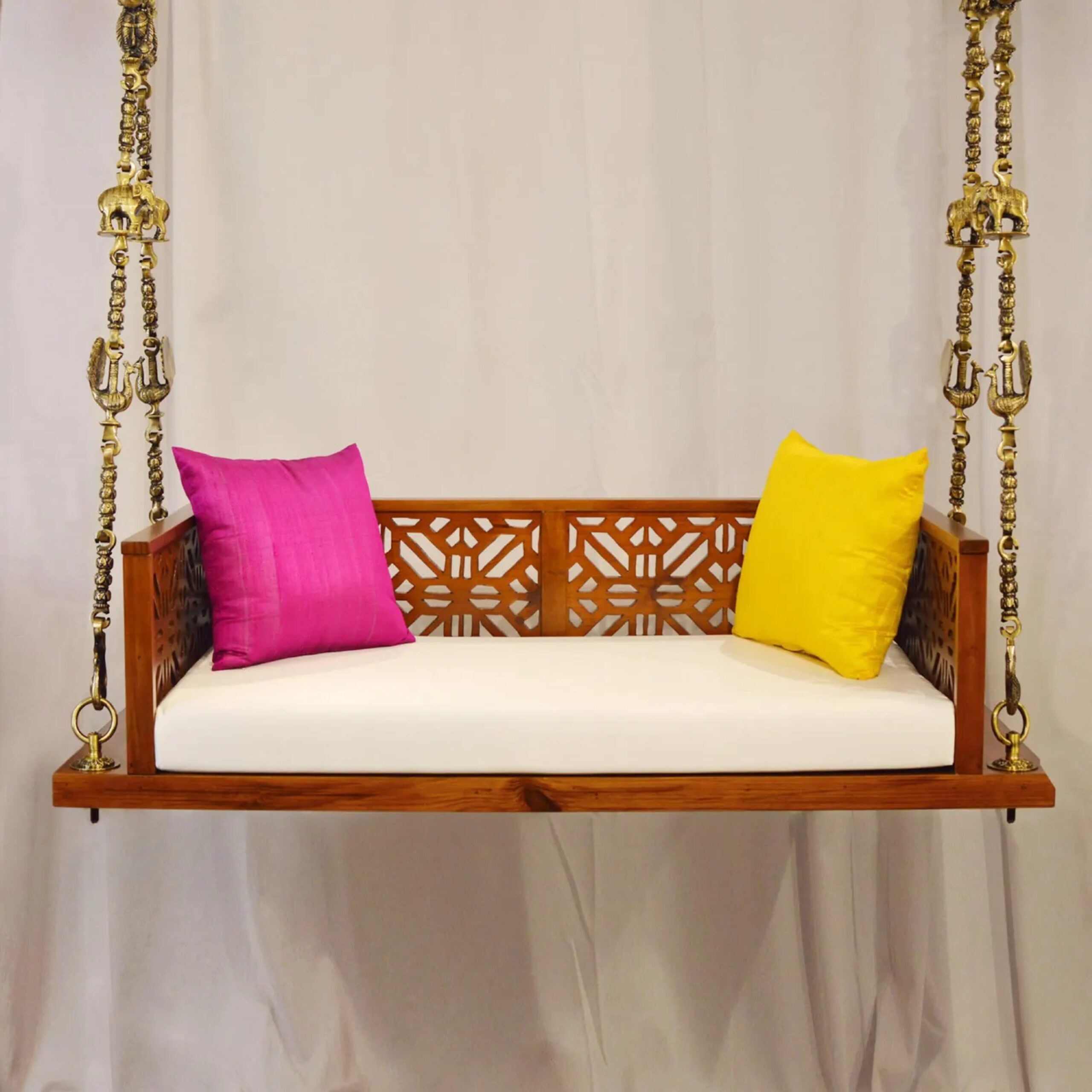 The Teakwood Luxury Hanging Swing in Gold Paint by Shalvika Living Innovations is a beautifully handcrafted piece that exudes elegance and luxury for any home. Designed with both comfort and style in mind, this swing is perfect for children and adults alike. The jali pattern backrest not only enhances its design but also provides excellent support while swinging. The swing is suspended by a strong pure brass chain, intricately adorned with elephant, horse, and peacock motifs, adding a touch of tradition and grandeur.