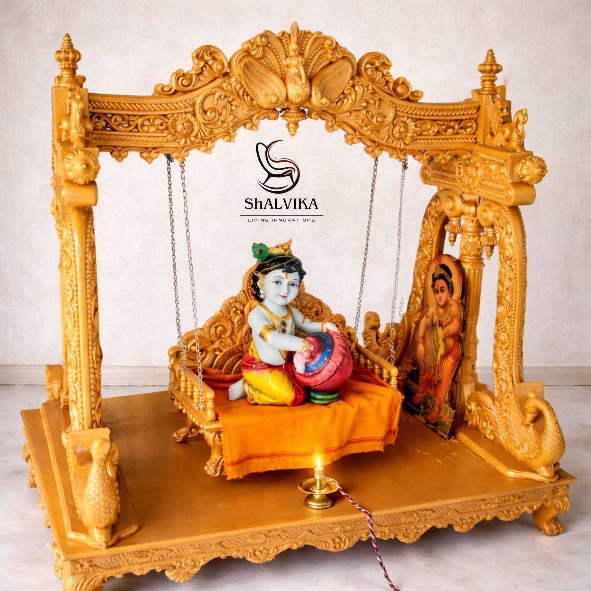 Bring home this peacock carved Krishna Ji Jhula from Shalvika Living and add elegance, devotion, and timeless craftsmanship to your space.