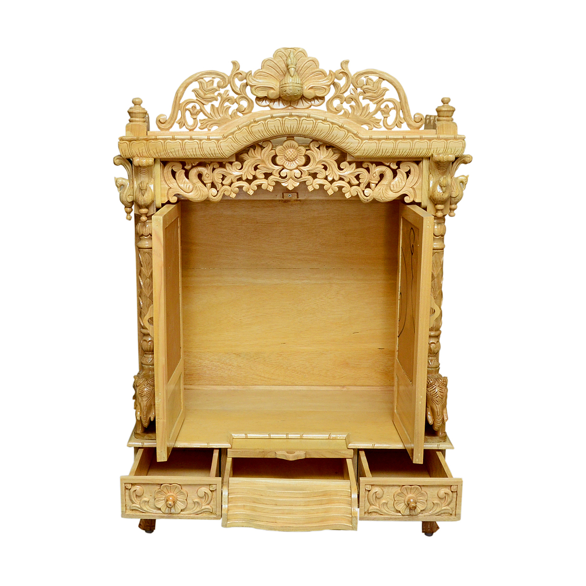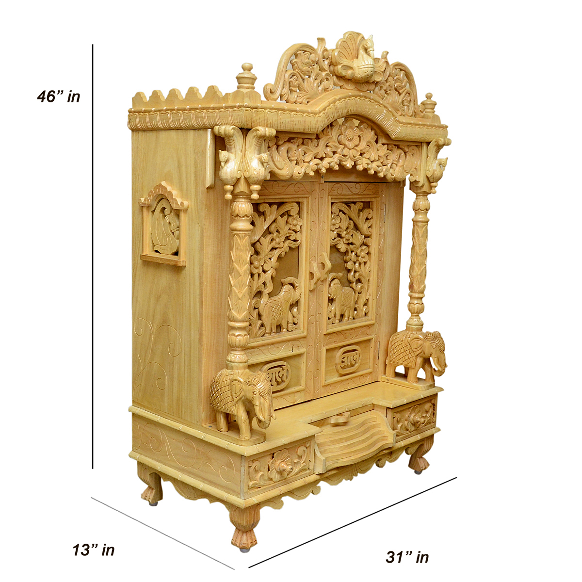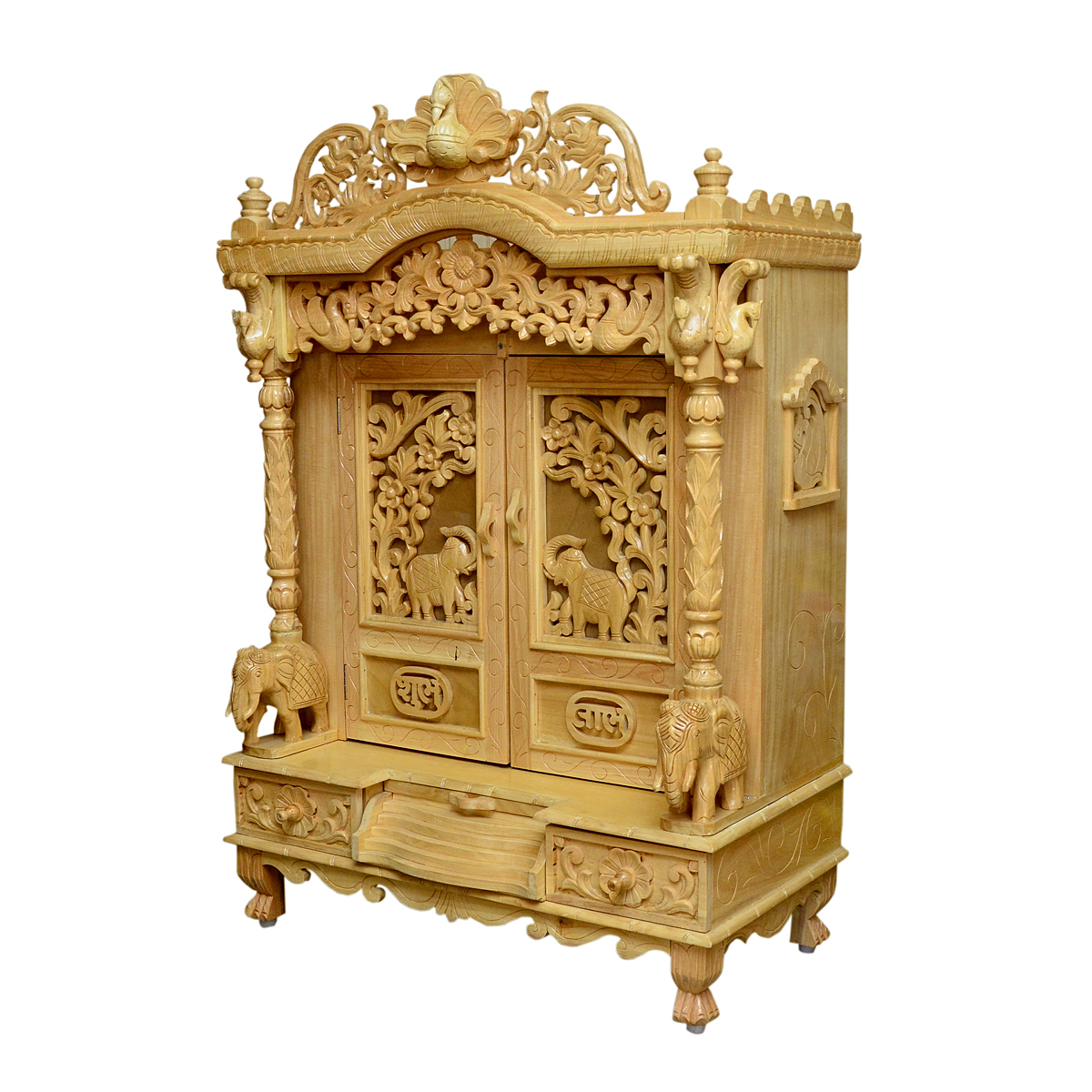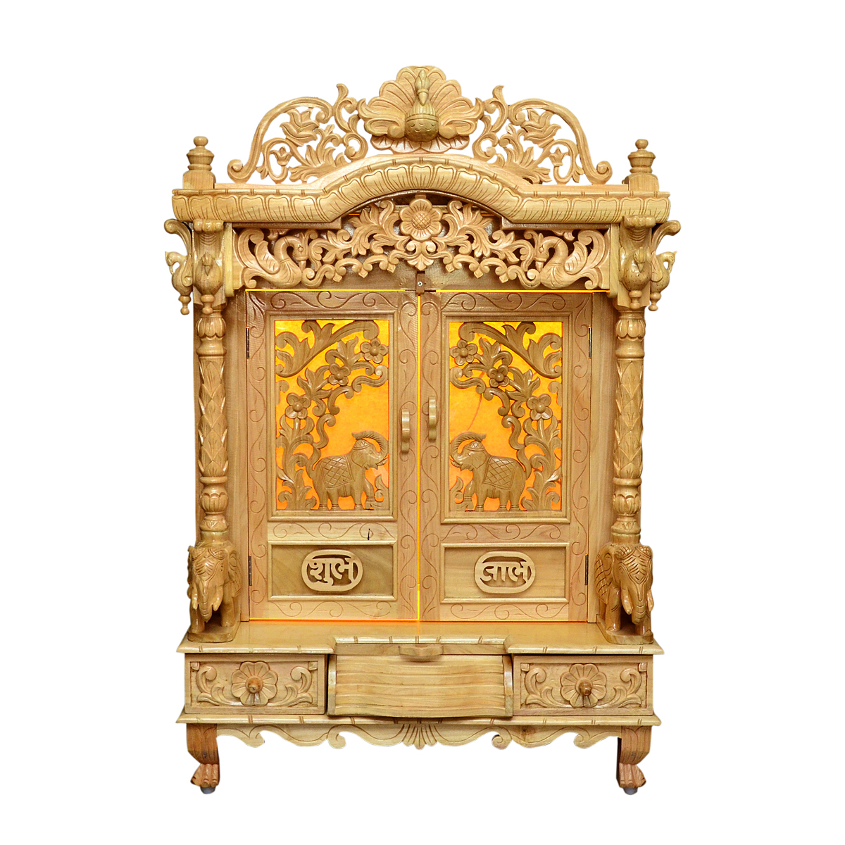 Traditional Handcarving Sevan Wood Mandir with Natural Polish & LED Lights – Shalvika Living Innovations