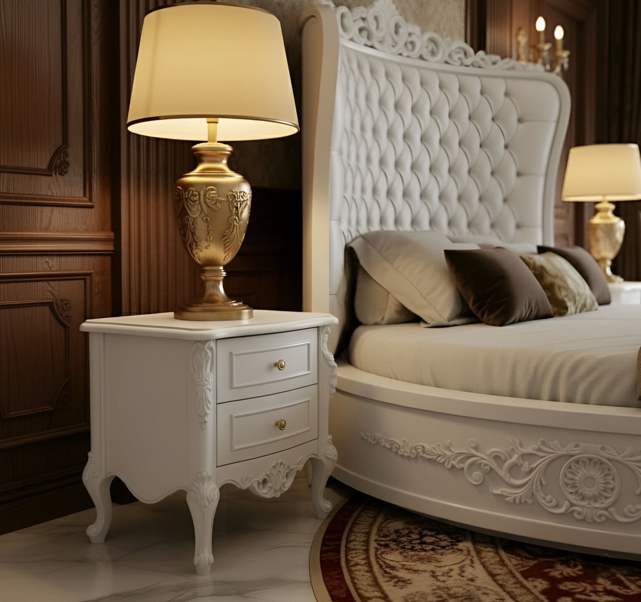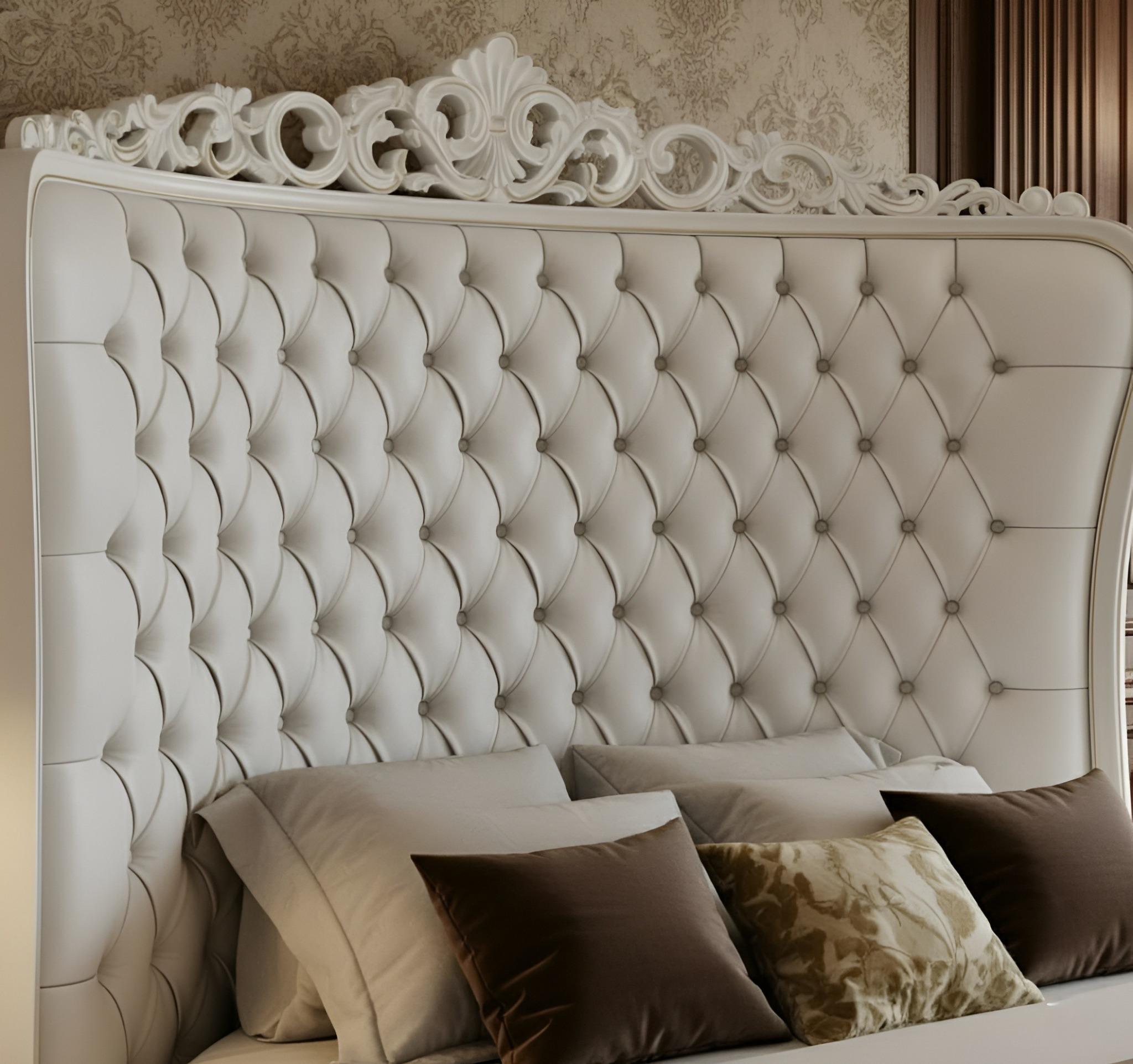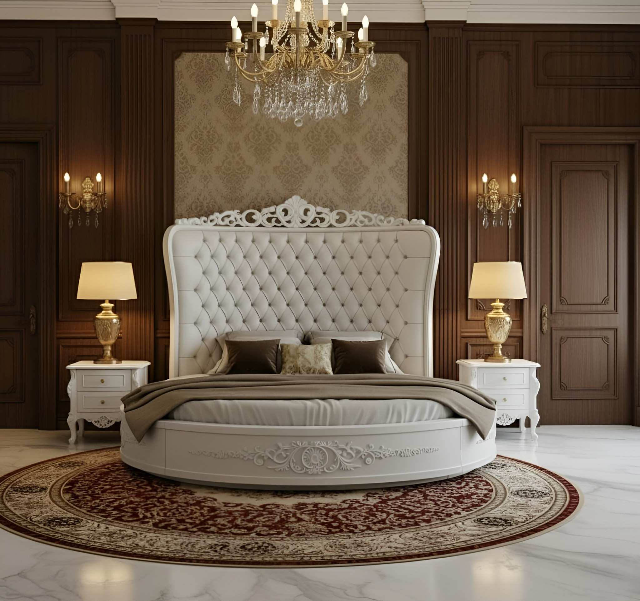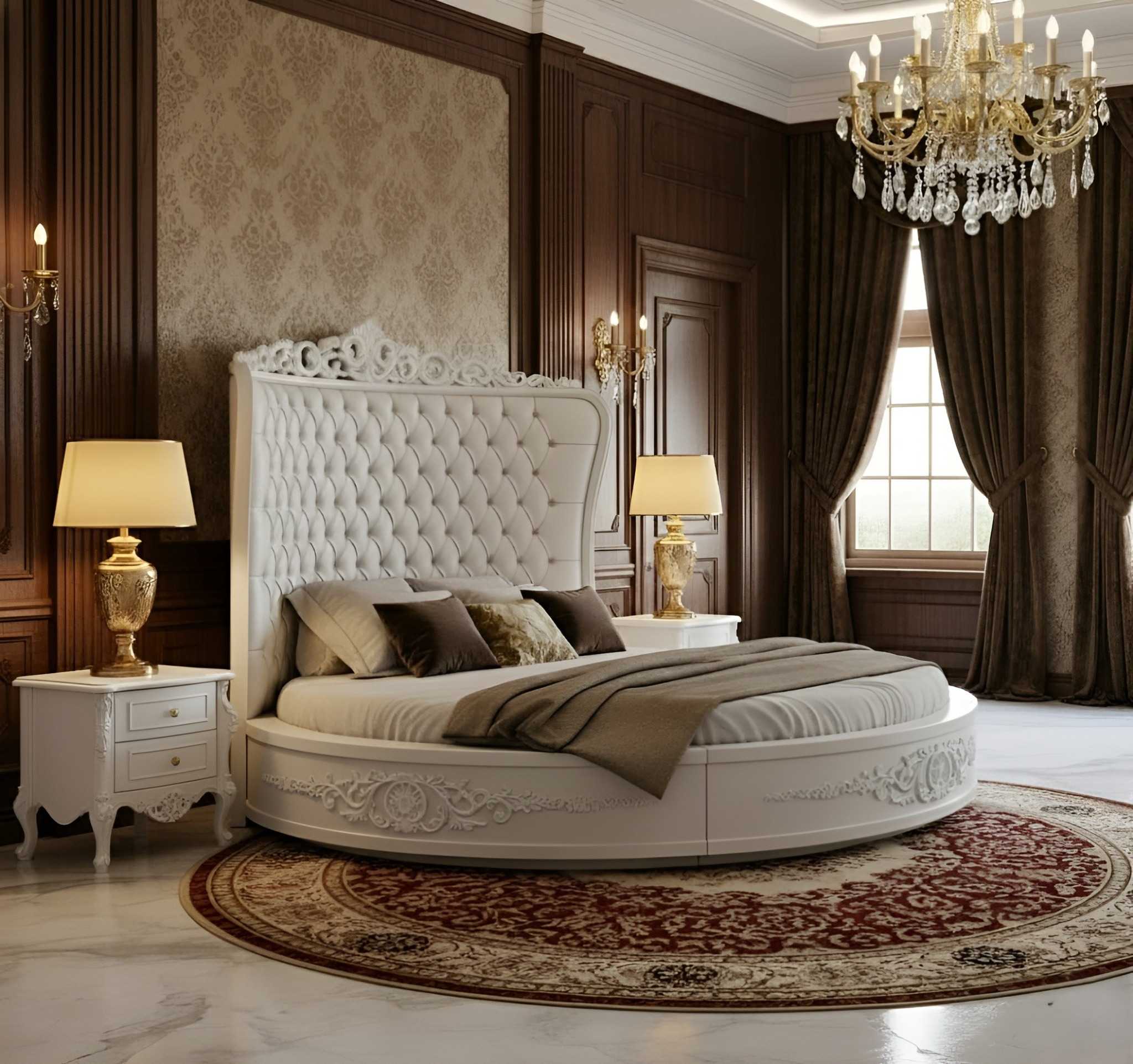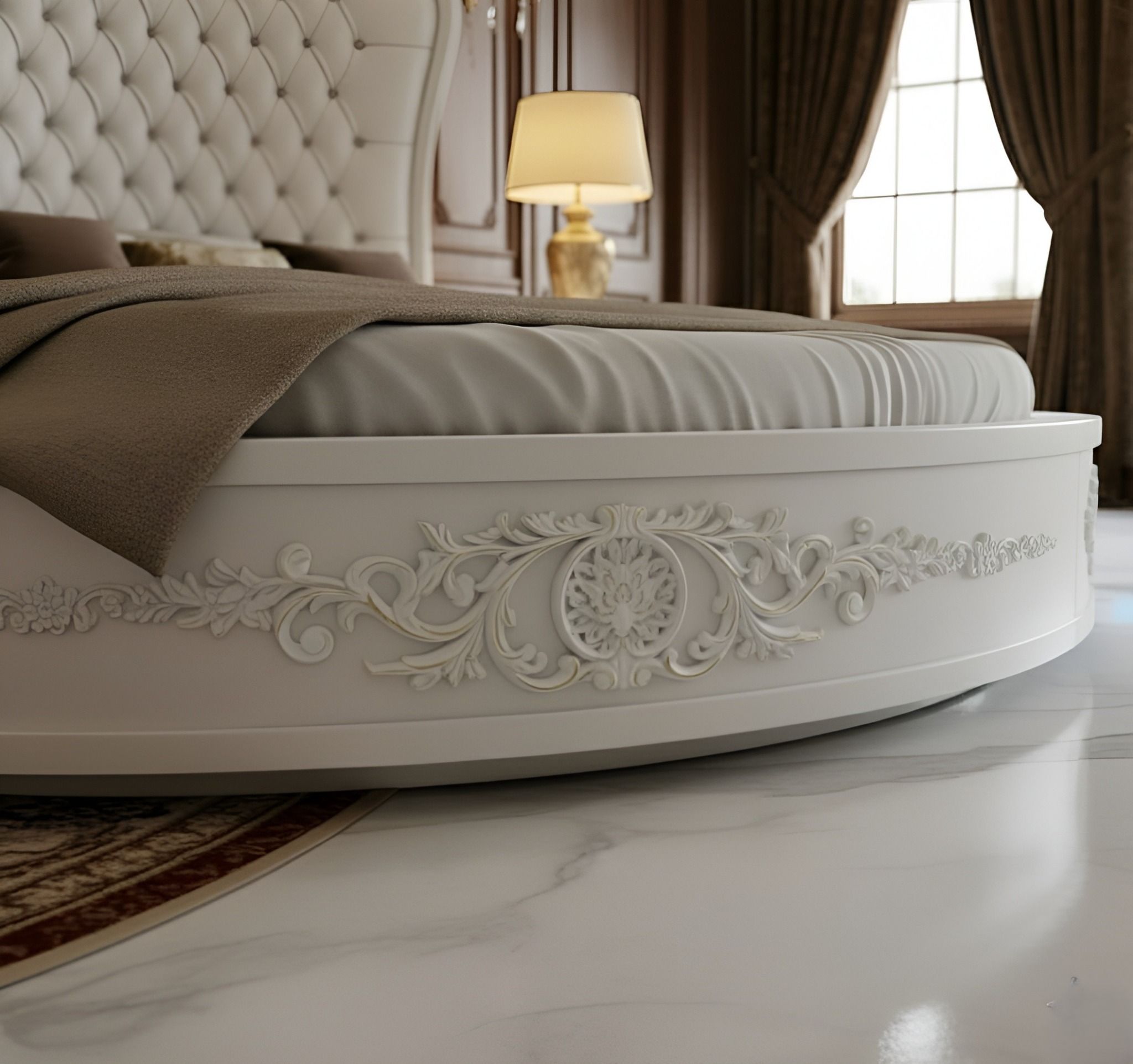 The bed features a tall upholstered headboard with diamond-tufted detailing, offering exceptional comfort while sitting or relaxing. The hand-carved frame around the headboard adds a subtle royal touch without disturbing the clean, modern white theme. The round wooden base is adorned with elegant molding work and artistic carvings, enhancing the bed’s overall beauty.