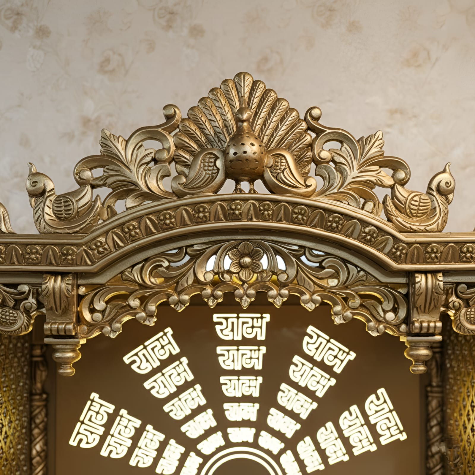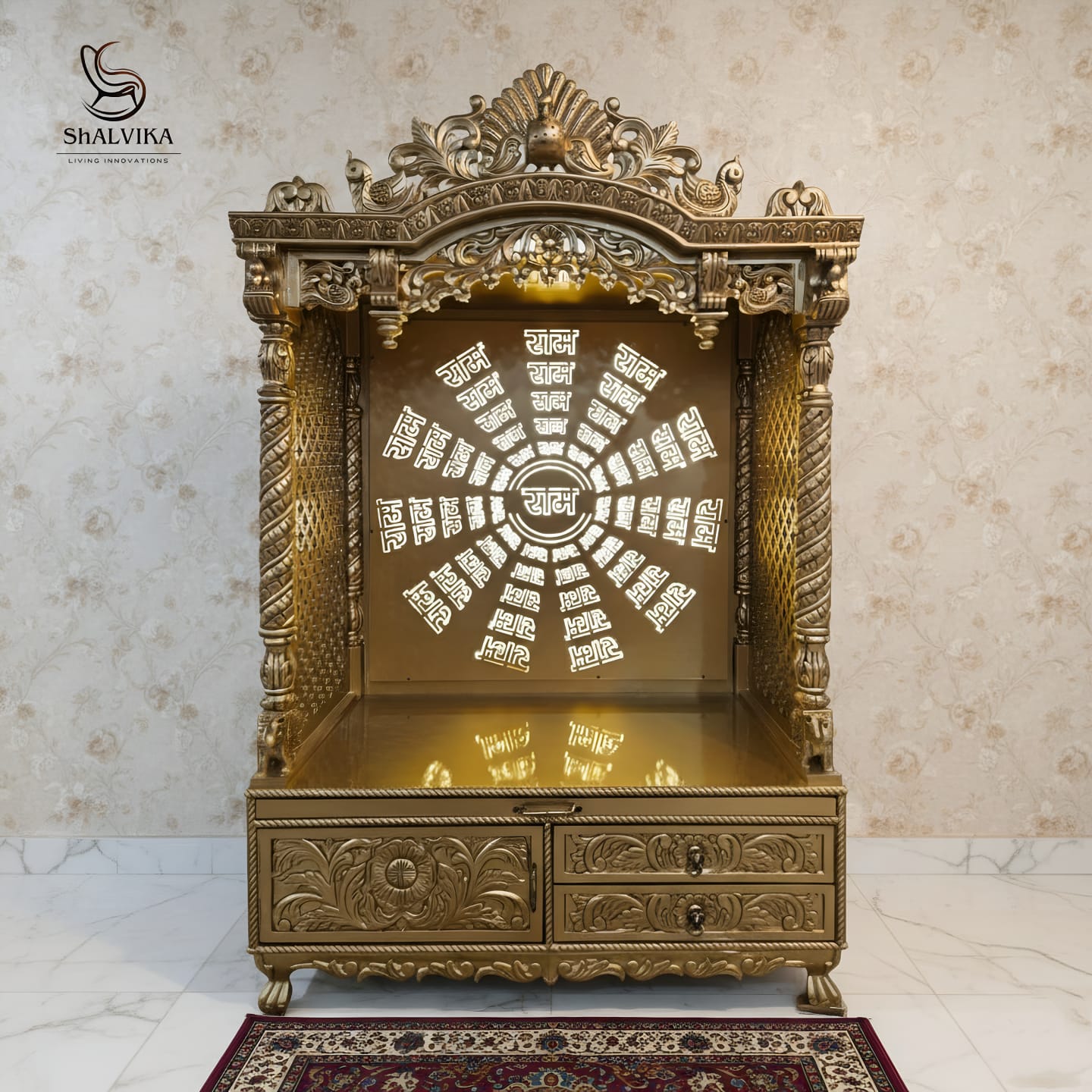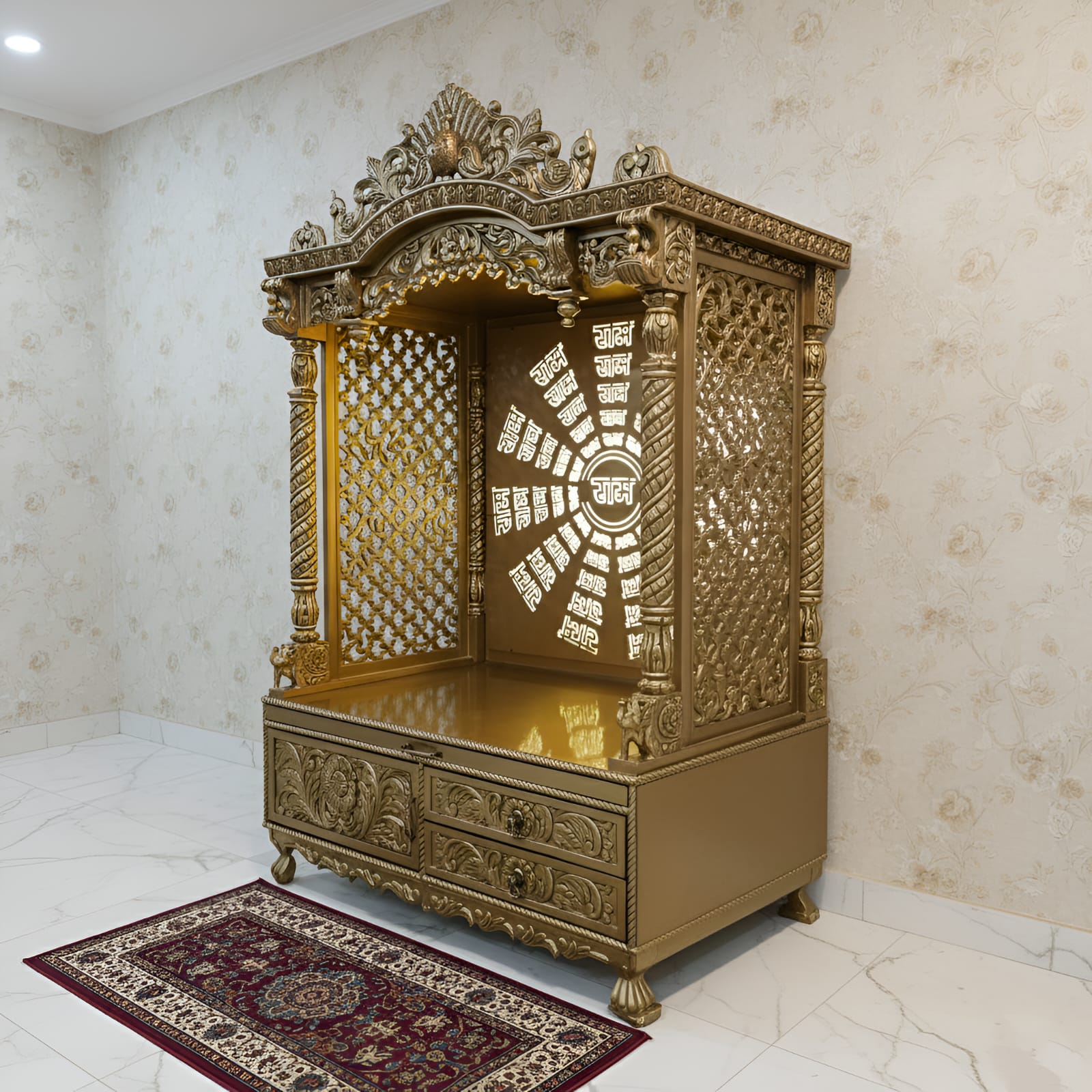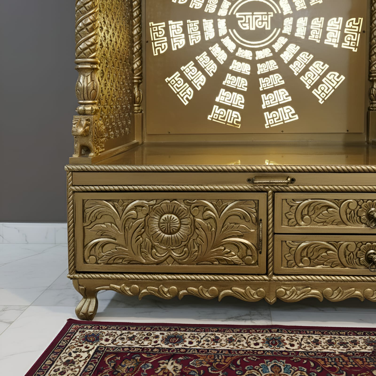 • Premium Wooden Carved Mandir in Antique Gold Finish