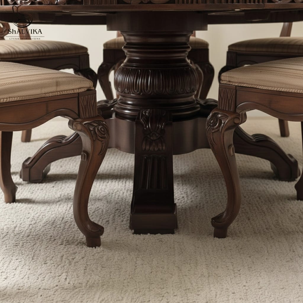 The dining set features a solid round table with a finely carved pedestal base, offering both strength and a luxurious appearance. The six chairs are hand-carved by skilled artisans from Saharanpur, a city known for its heritage wood craftsmanship. Each chair includes a carved backrest and cushioned seat, ensuring comfort and elegance in every meal.