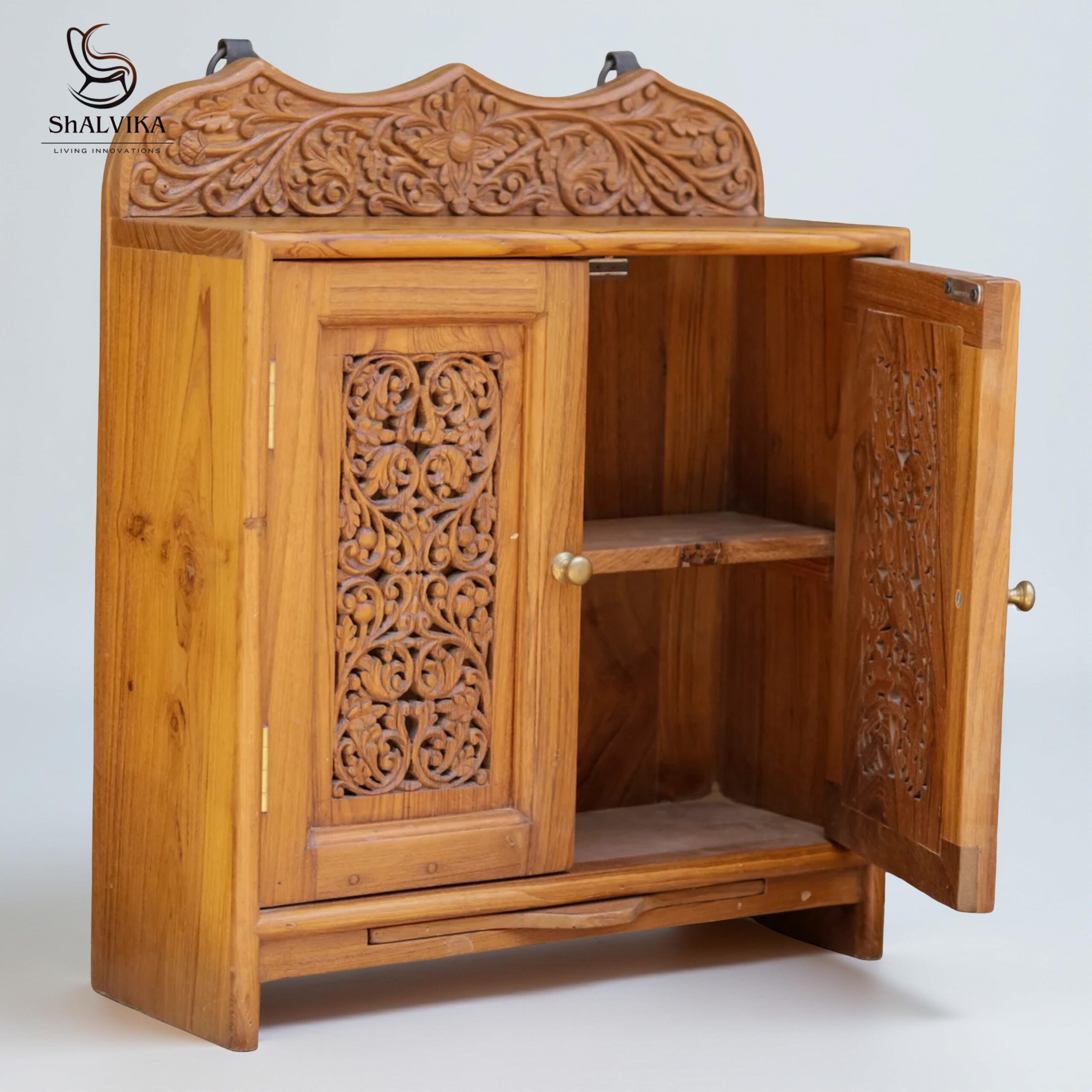 Made from premium quality teak wood, this temple features double doors with intricate carvings that highlight the skill of master artisans. The doors are functional, opening smoothly to reveal a spacious inner sanctum for your idols, puja items, or sacred symbols. Each temple is hand-finished to preserve the natural grain of the wood, giving it a timeless appeal that complements modern and traditional home interiors.