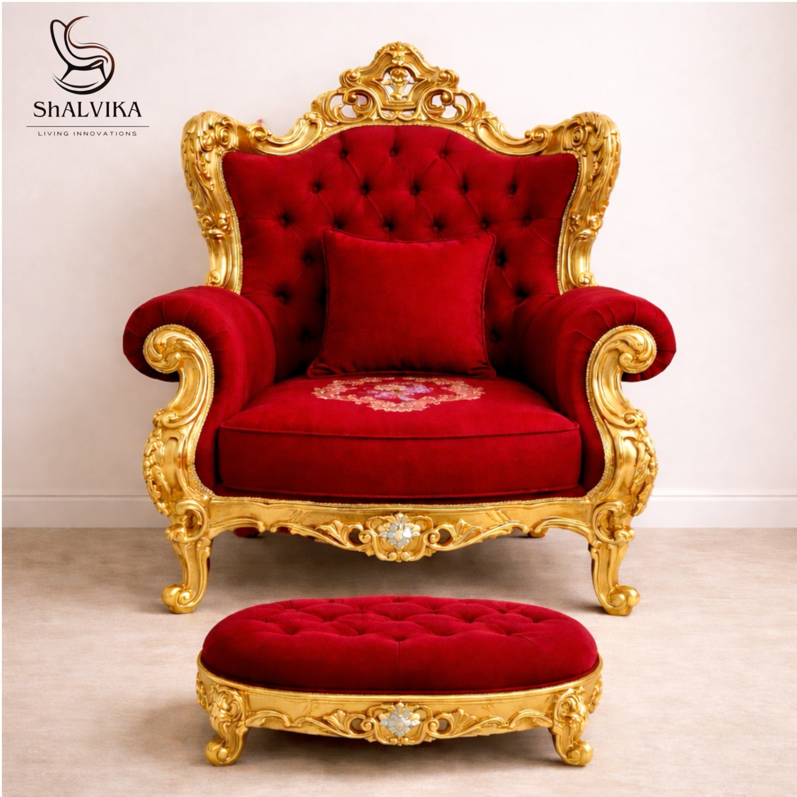 Accompanied by a matching wooden chowki (footrest), this royal chair becomes a complete throne-style setup for temples, ashrams, or spiritual spaces. It is not only a symbol of divine respect but also an eye-catching piece of décor that enhances the spiritual atmosphere of any room.