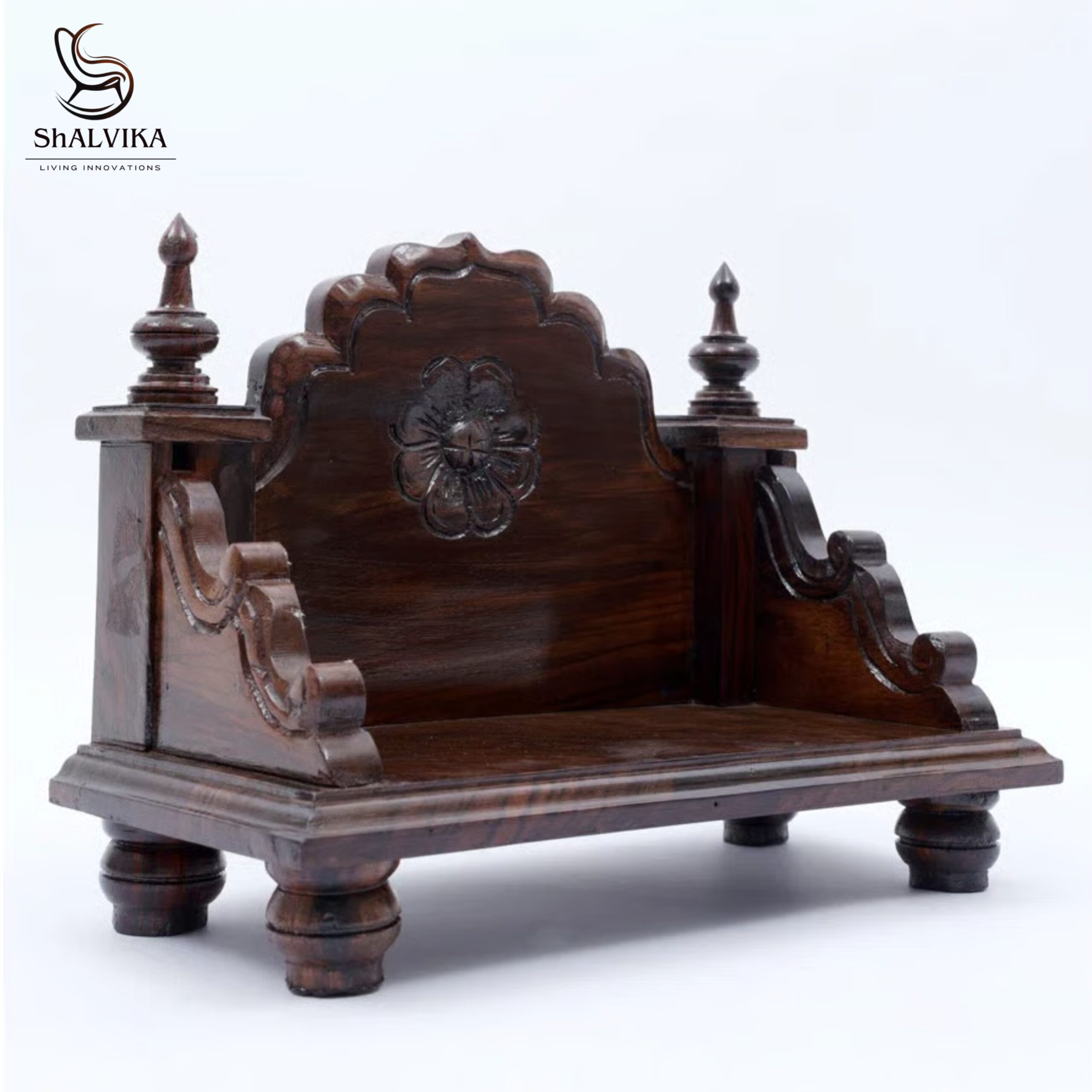 Elevate the sanctity of your home with this Wooden Handcrafted Puja Chowki Singhasan by Shalvika Living Innovations. Expertly crafted from premium quality solid wood, this chowki singhasan combines durability, elegance, and spiritual charm. Its dark brown hand-painted finish enhances the traditional appeal, making it perfect for home temples, pooja rooms, or as a base for idols and religious figurines.