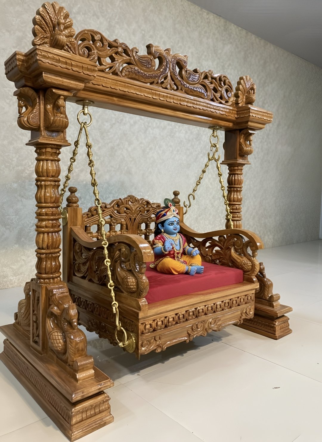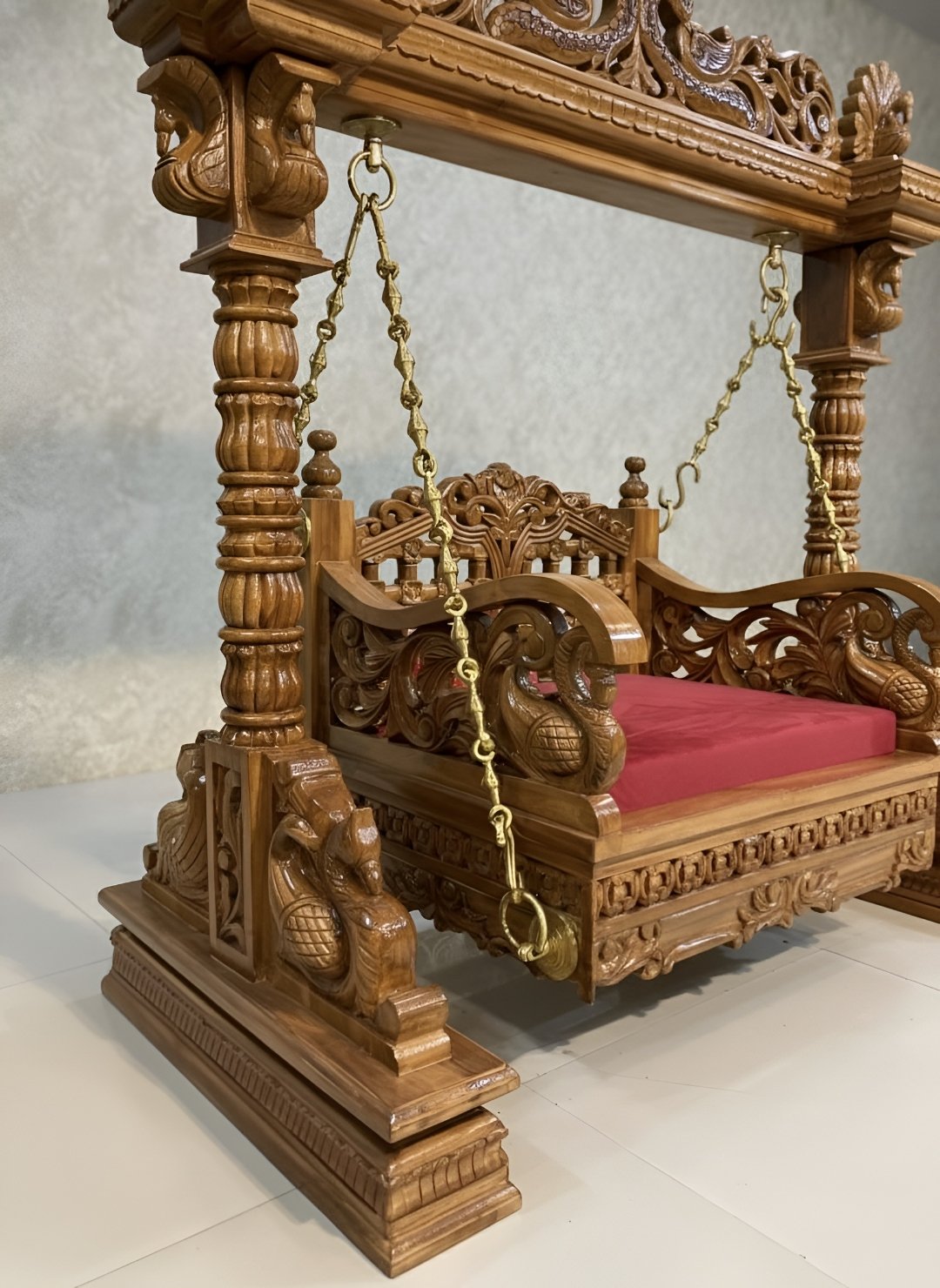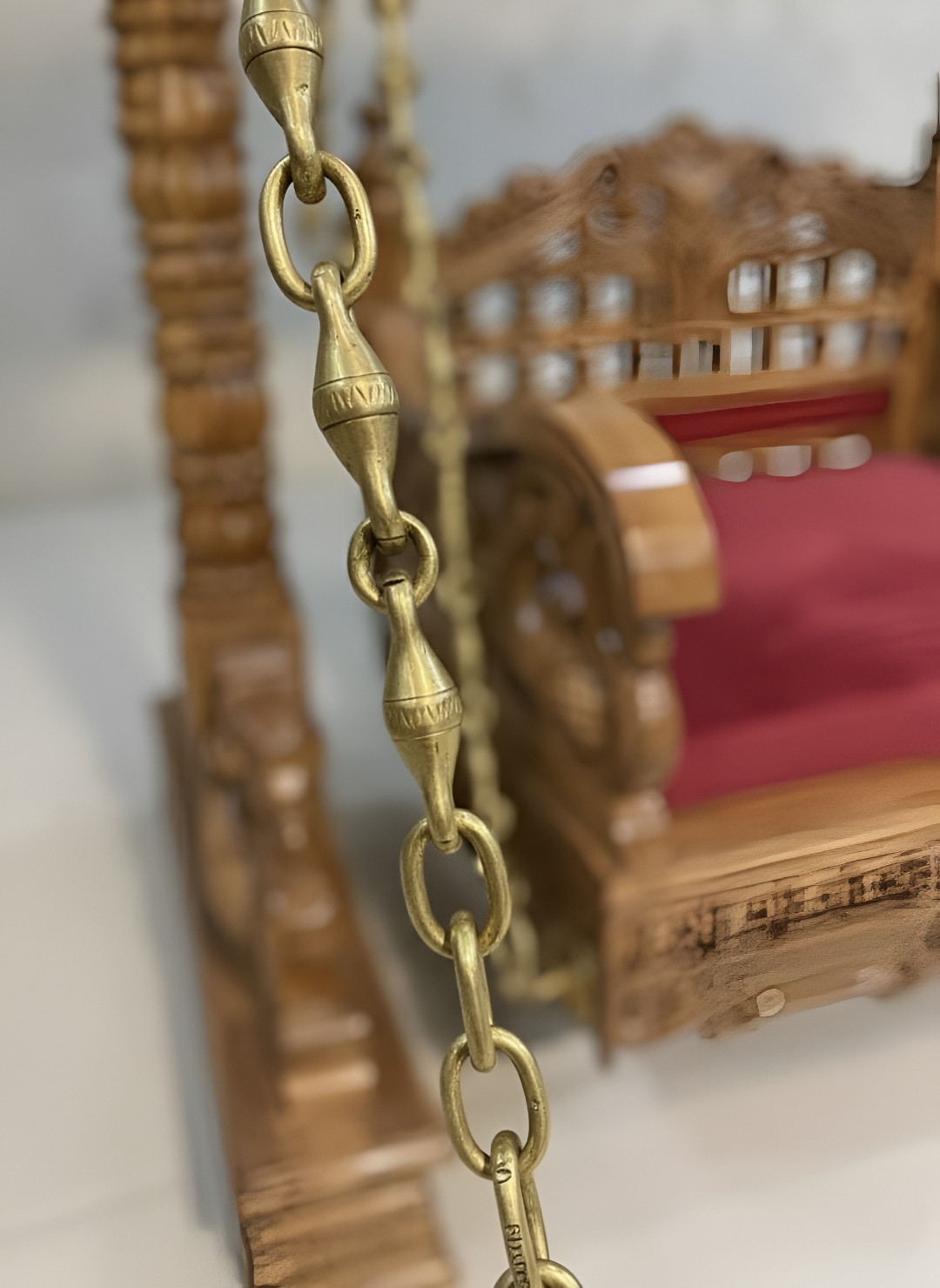Every part of the cradle is intricately hand-carved, including the pillars, backrest, arch, and side panels. The traditional floral and peacock patterns reflect the fine craftsmanship of skilled artisans. The jhula is supported by heavy solid brass chains, strong enough to hold up to 250 kg, ensuring complete stability and smooth swing movement during pooja rituals.