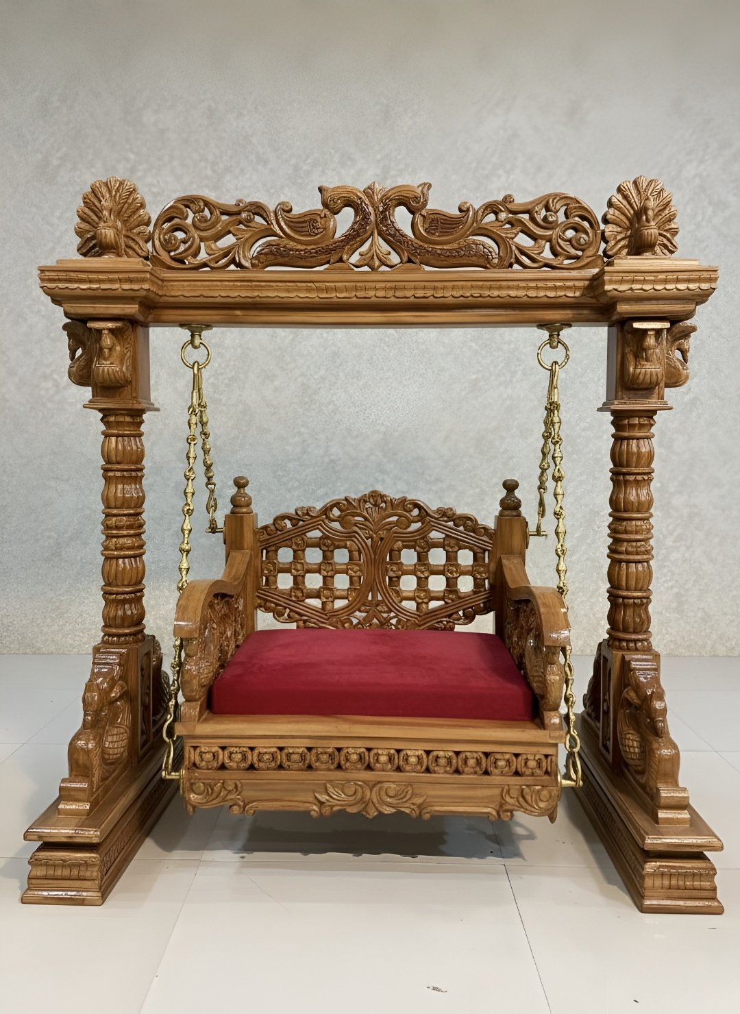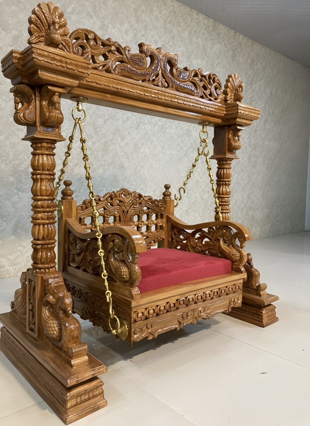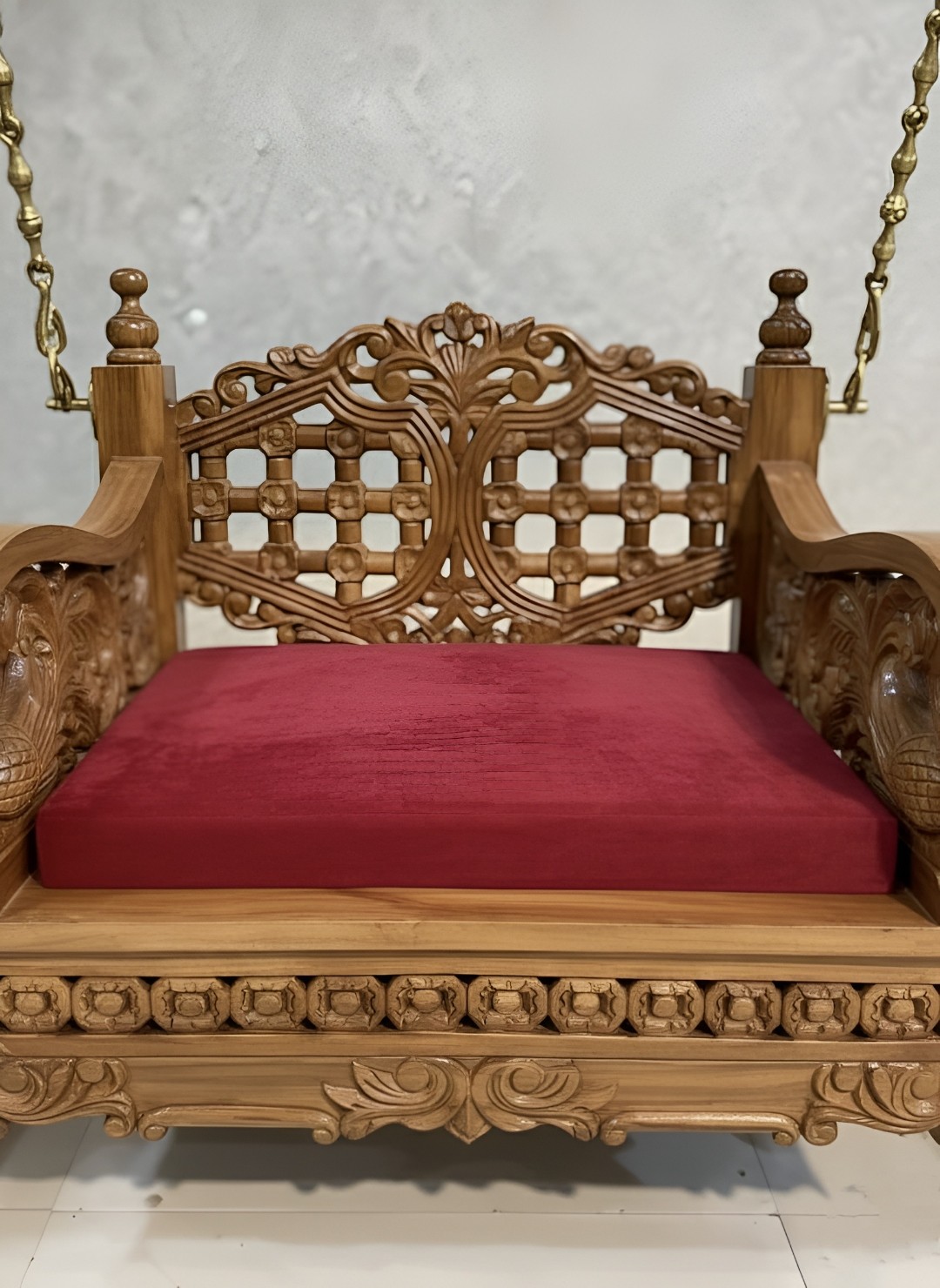 Every part of the cradle is intricately hand-carved, including the pillars, backrest, arch, and side panels. The traditional floral and peacock patterns reflect the fine craftsmanship of skilled artisans. The jhula is supported by heavy solid brass chains, strong enough to hold up to 250 kg, ensuring complete stability and smooth swing movement during pooja rituals.