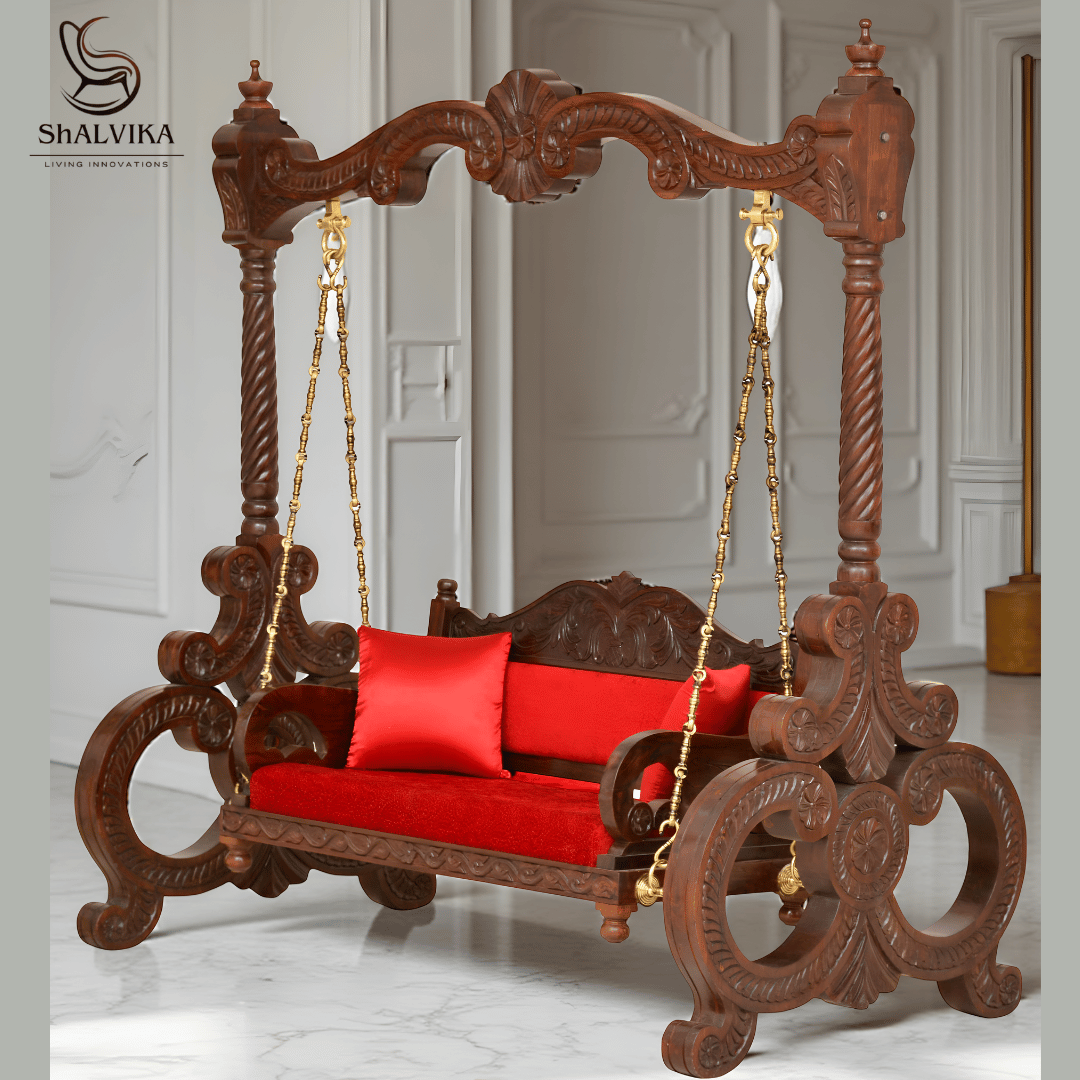 The Wooden Jhula with Stand for Home by Shalvika Living Innovations is a stunning example of traditional craftsmanship and luxury. Handcrafted from premium quality solid wood, this swing adds a royal touch to any home. The detailed hand carvings and smooth polished finish highlight fine Indian artistry, making it both elegant and durable.