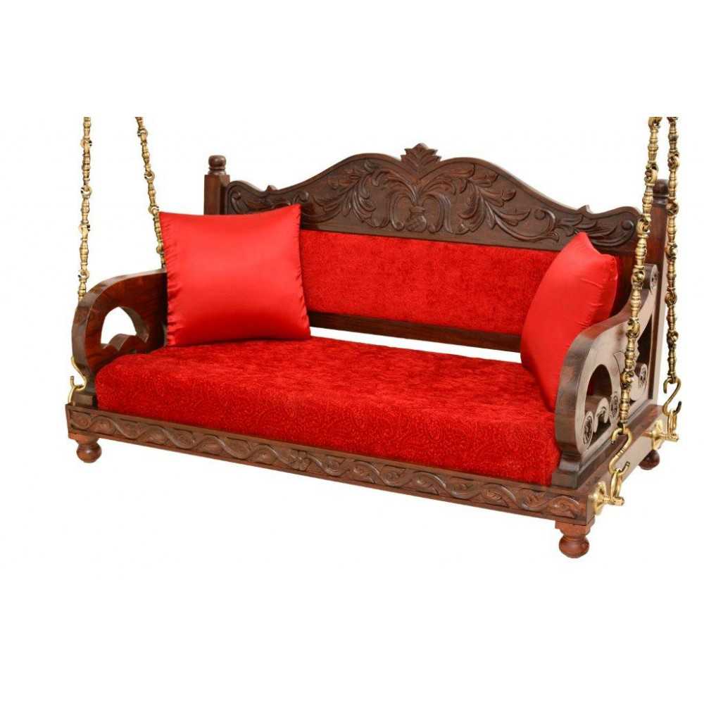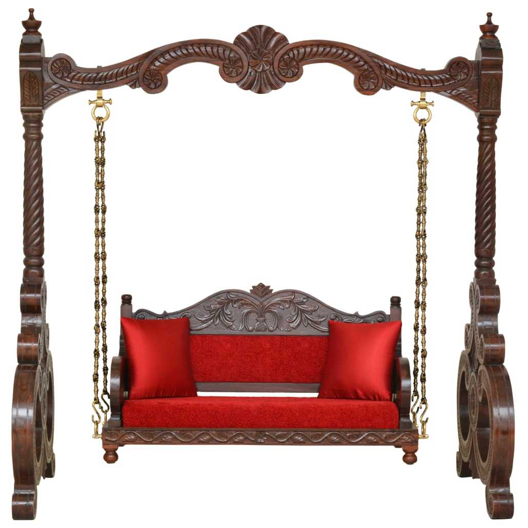 The swing comes with a comfortable red cushioned seat and matching pillows, offering both style and relaxation. Sturdy brass chains provide smooth movement and a strong hold, adding to its majestic appeal. Perfect for living rooms, verandas, or indoor courtyards, this Jhula creates a peaceful and graceful space for you to unwind.
