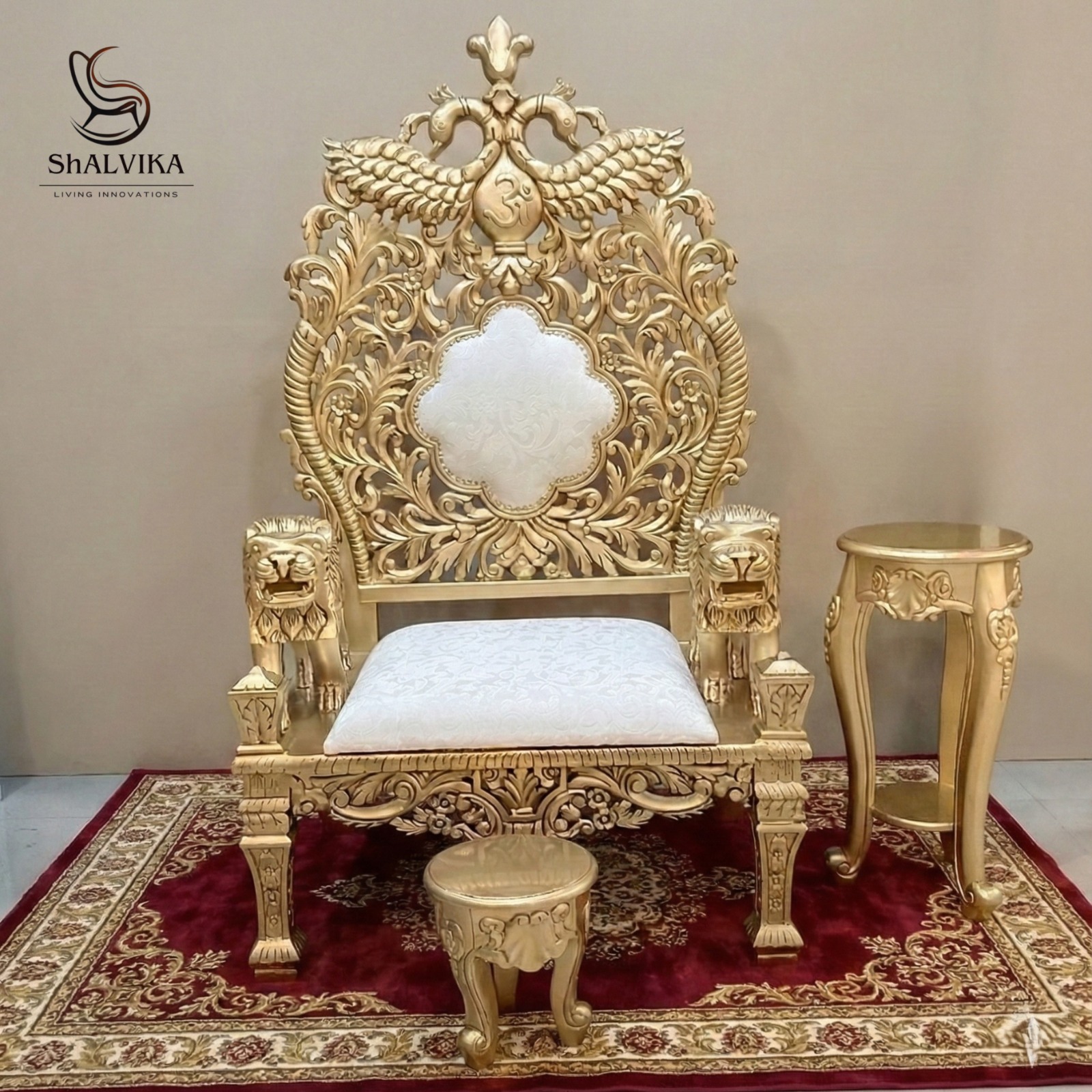 Finished with antique gold duco paint, the chair has a smooth, elegant, and royal appearance. This premium finish enhances the carved details and protects the wood from wear and tear. The antique gold tone blends perfectly with traditional and spiritual interiors.