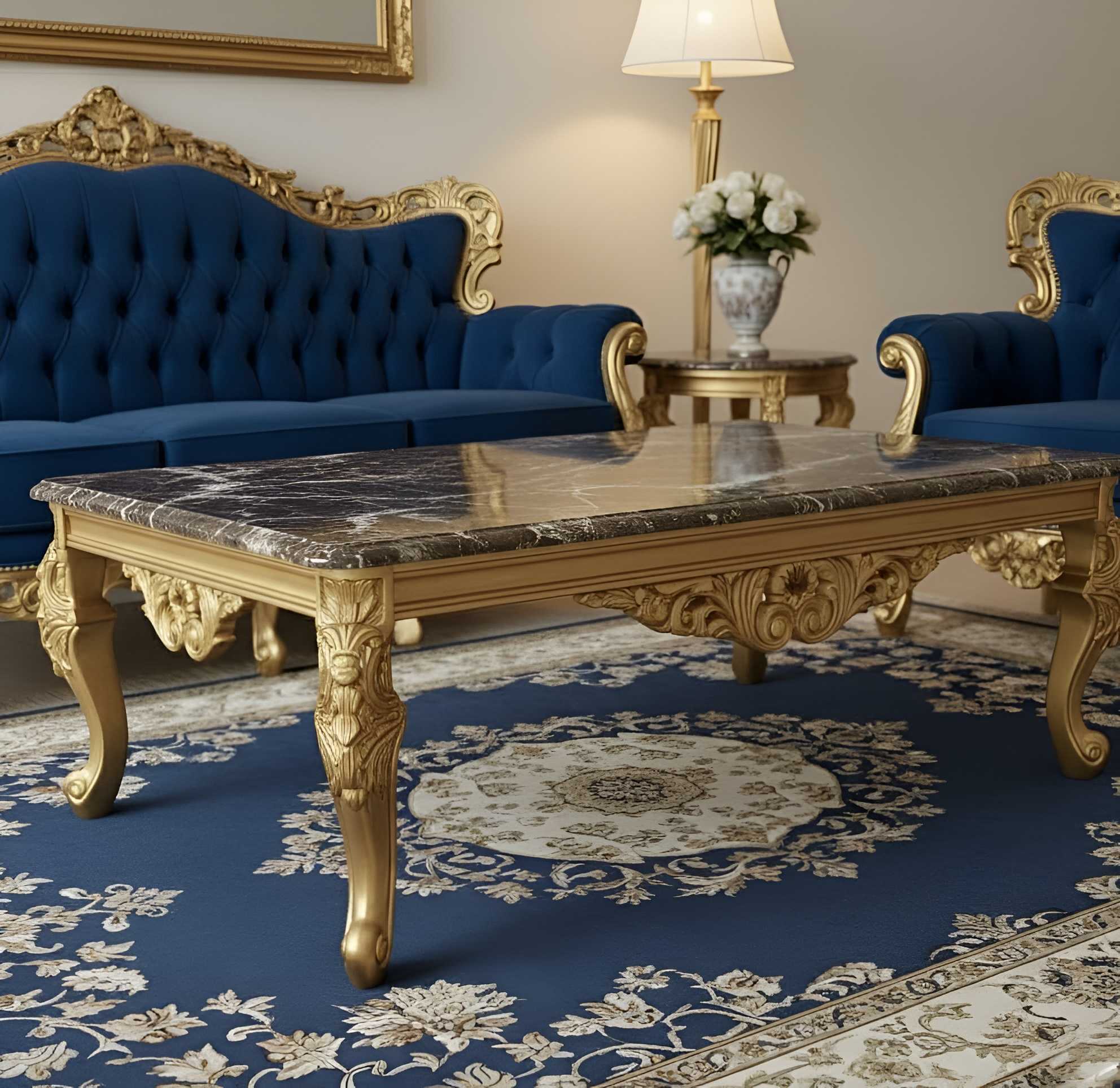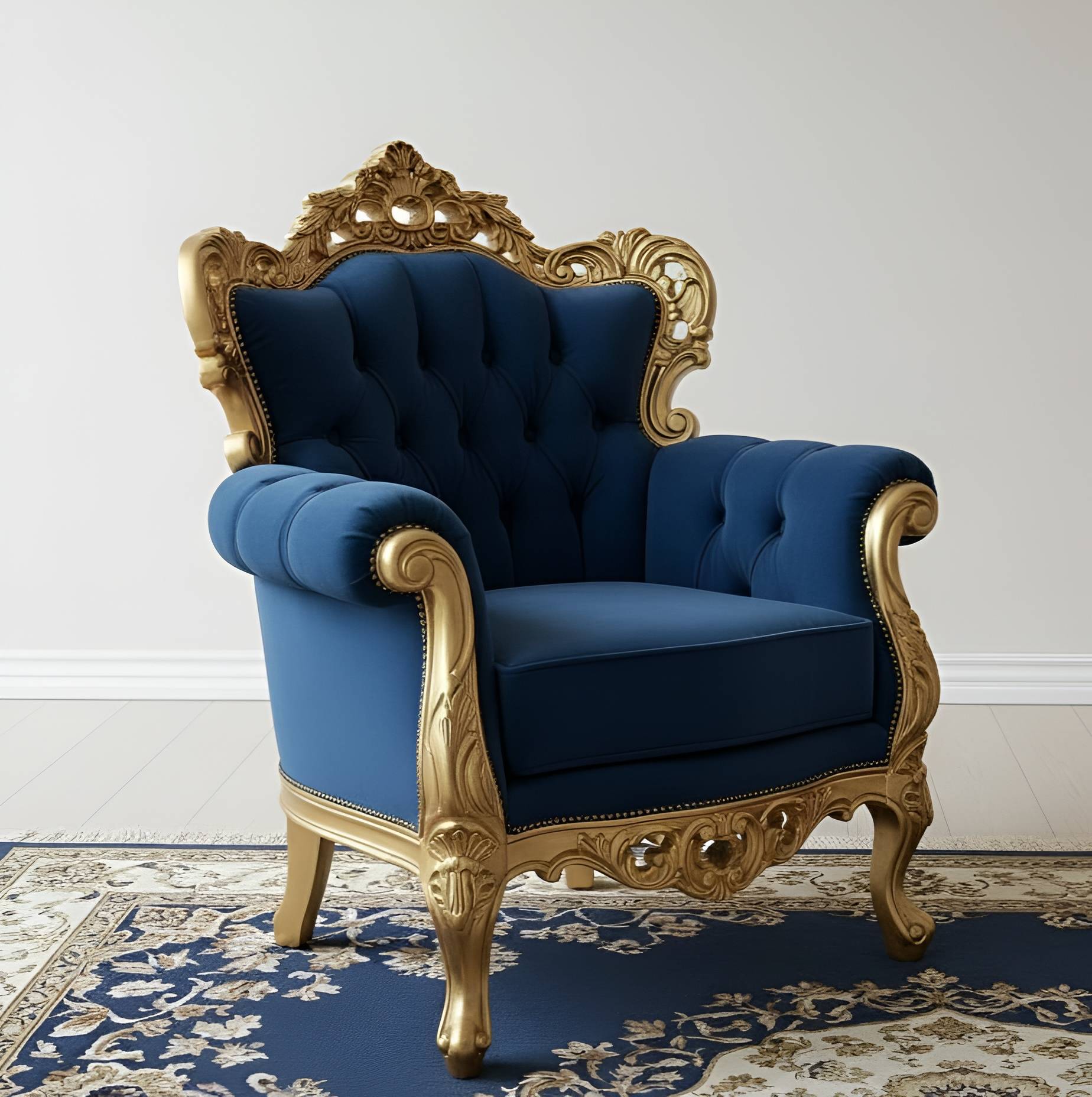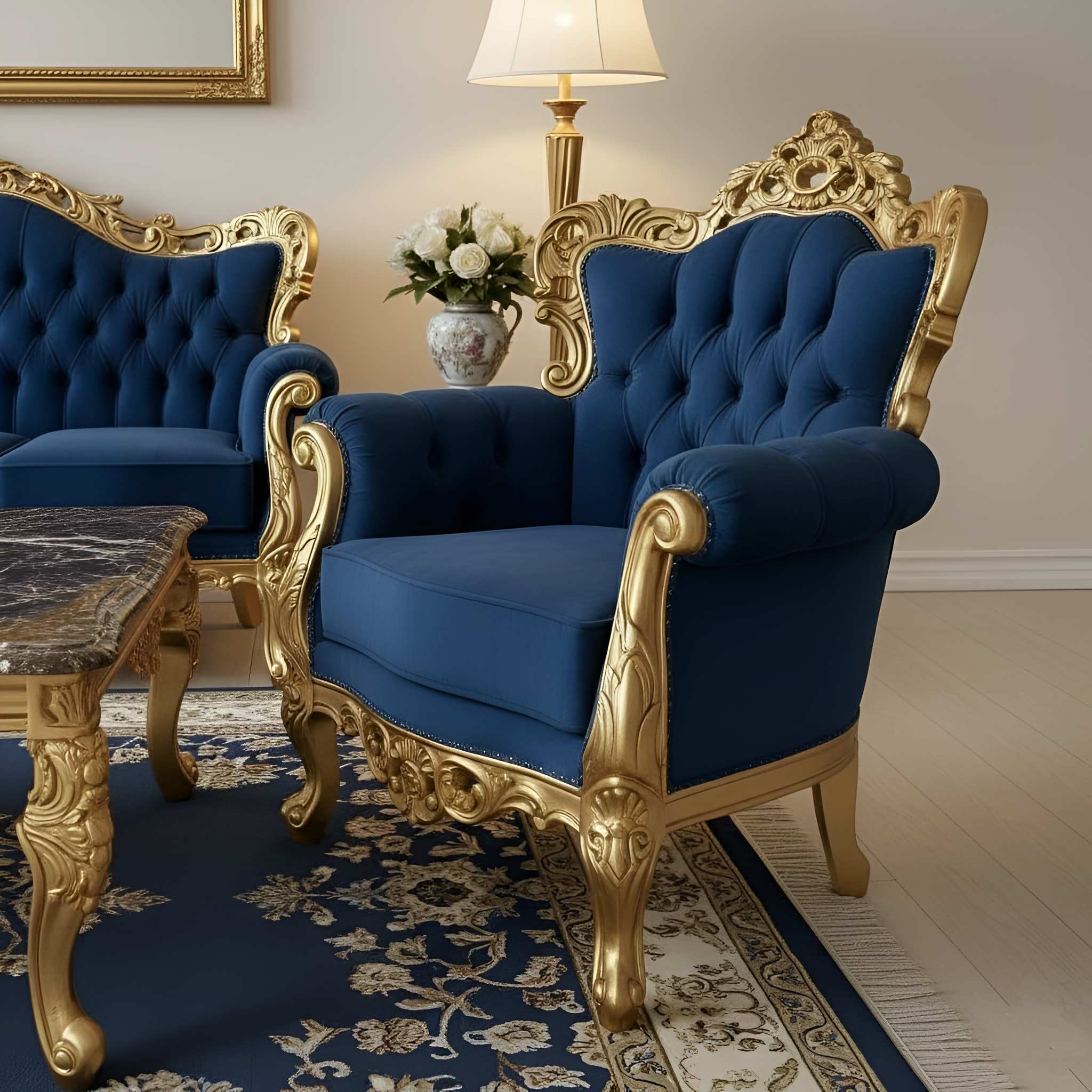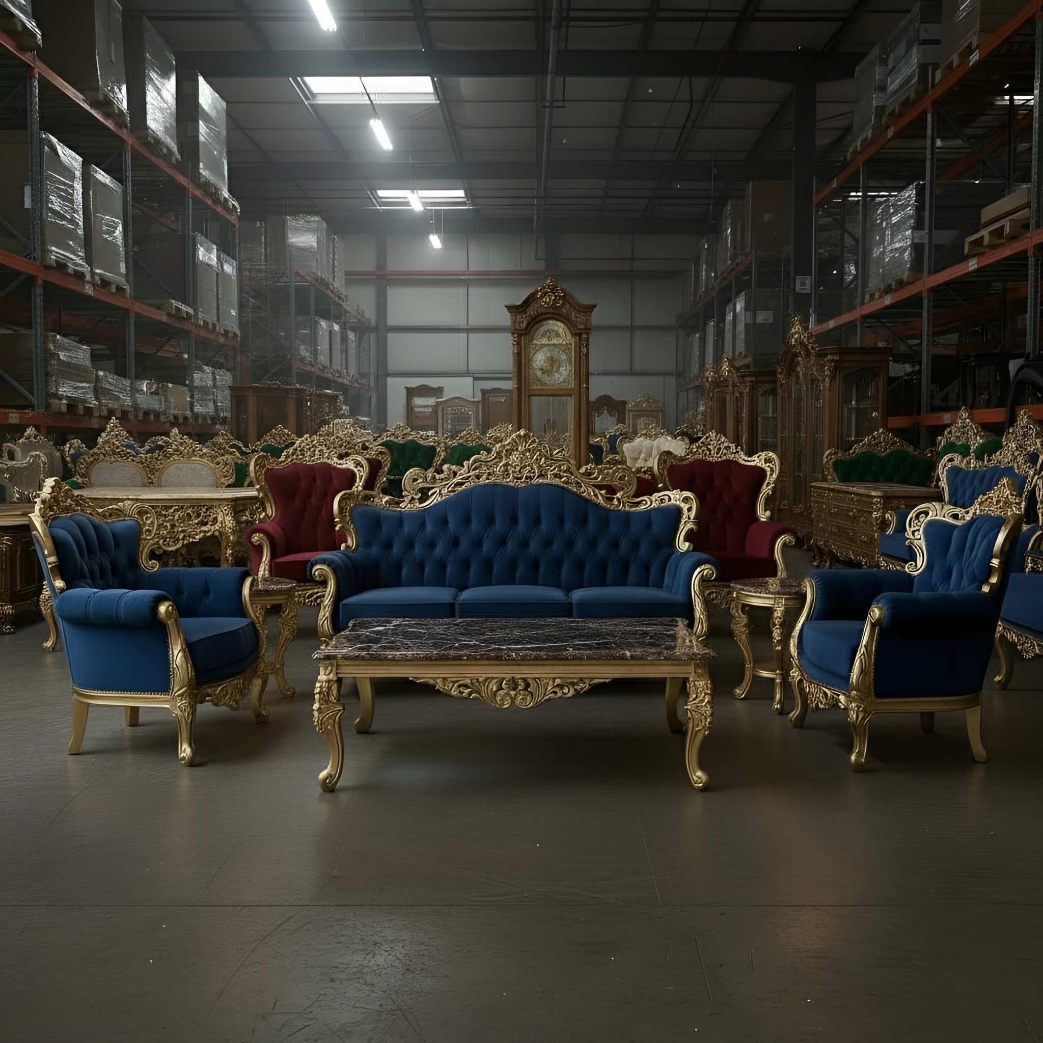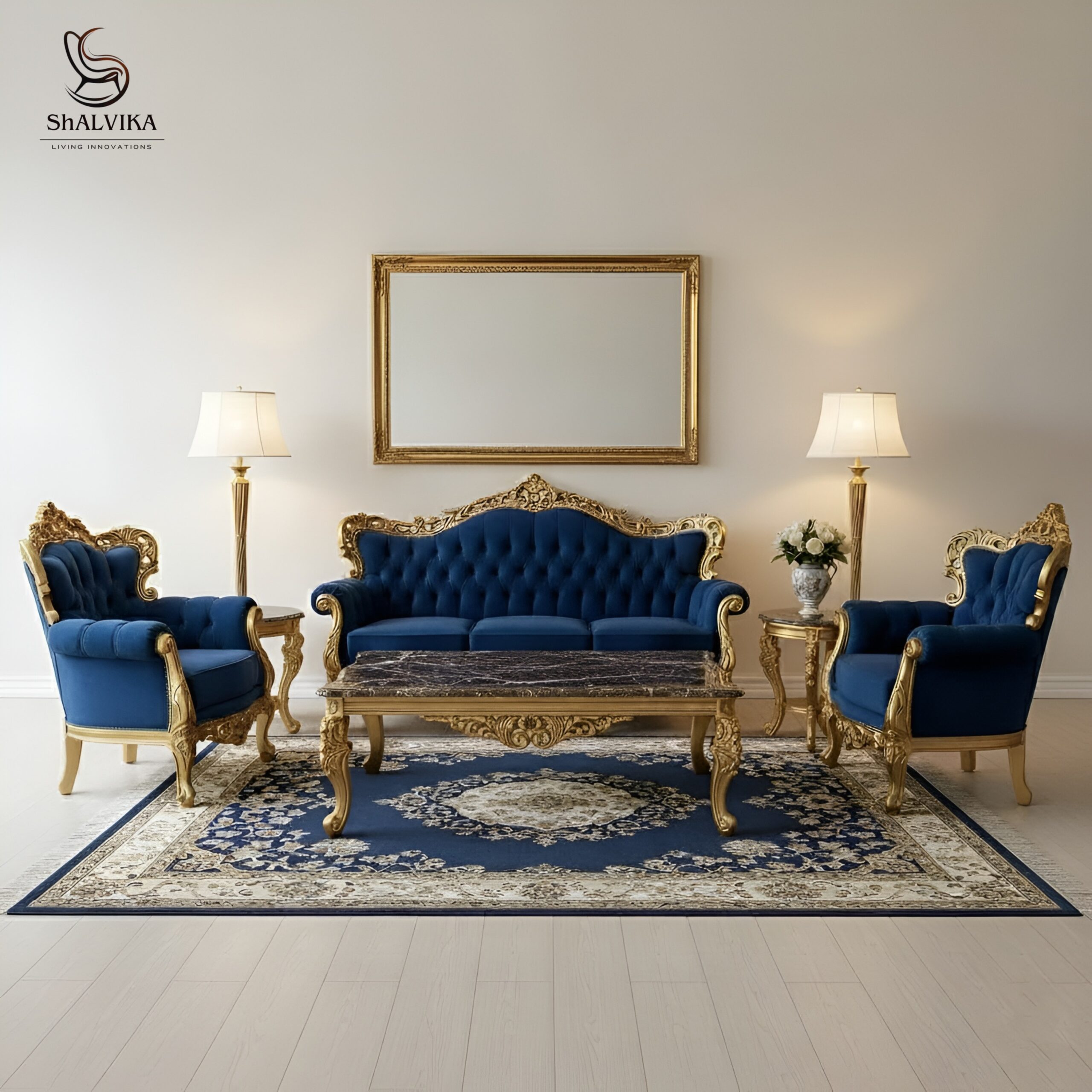 To enhance the beauty of the carving, the frame is coated with Antique Gold Duco paint, which adds a luxurious shine and elevates the royal appearance of the entire sofa set. With plush cushioning, a tufted backrest, and high-quality upholstery, this Royal Sofa Set Design offers exceptional comfort along with classic style. The royal blue fabric and golden frame together create a stunning combination that suits modern as well as traditional interiors.