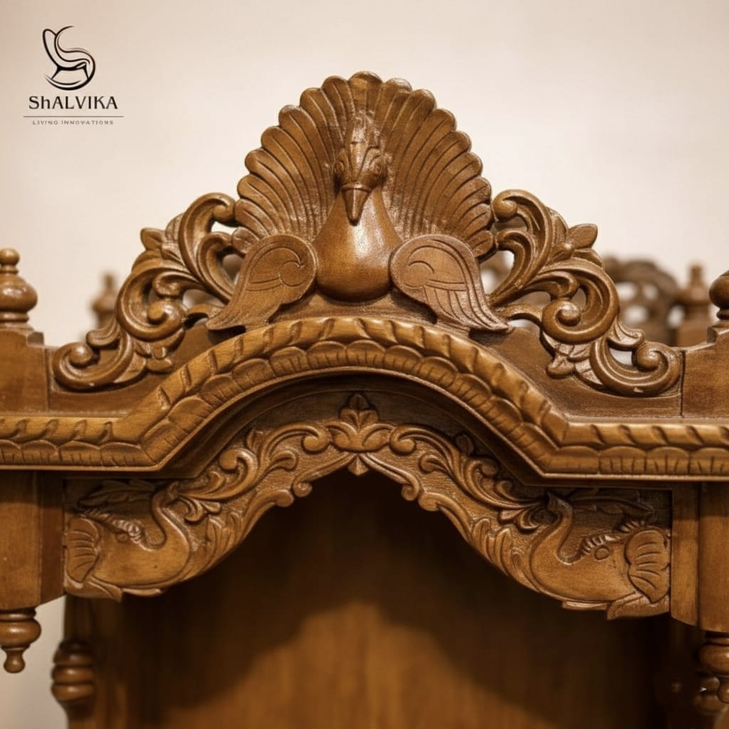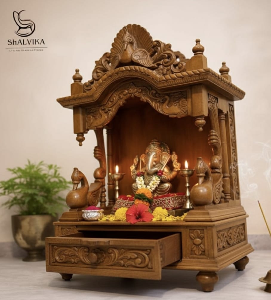 Hand-carved by Saharanpur’s skilled artisans, the temple features detailed pillars, floral engravings, and a beautifully carved dome with an “Om” symbol. The lower drawer allows easy storage of pooja essentials, while the strong wooden base ensures durability.