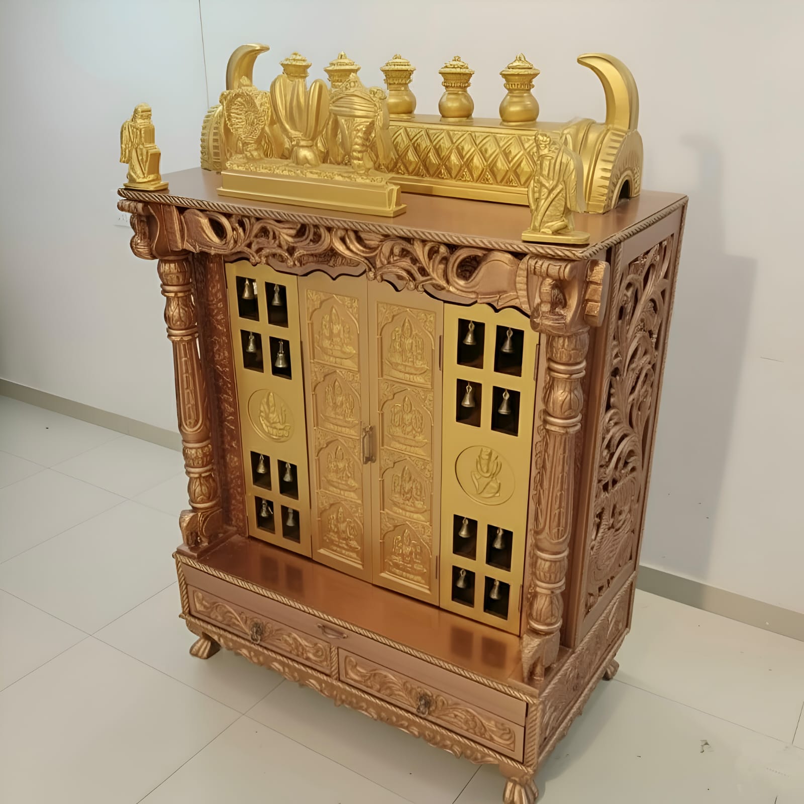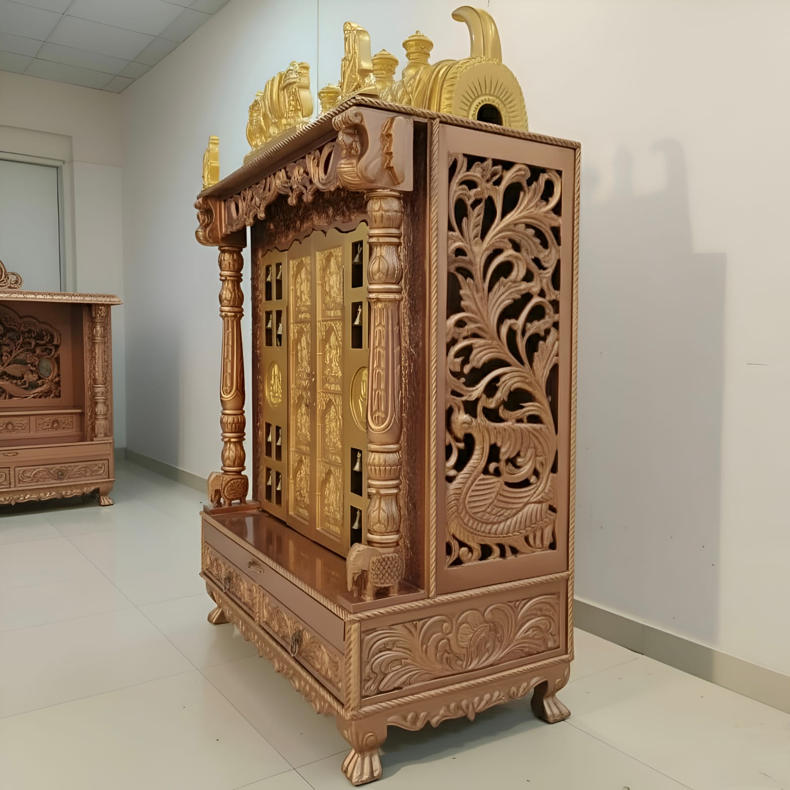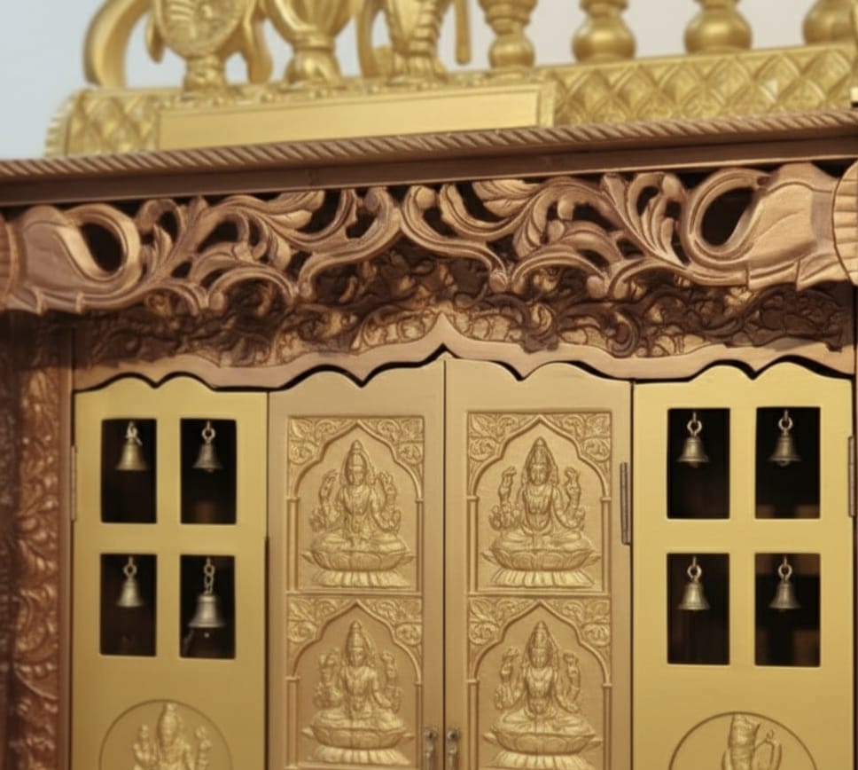 Available in multiple finishes—rose gold, copper, natural teak, white, gold, and more—this mandir can be fully customized to suit your home.